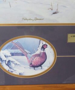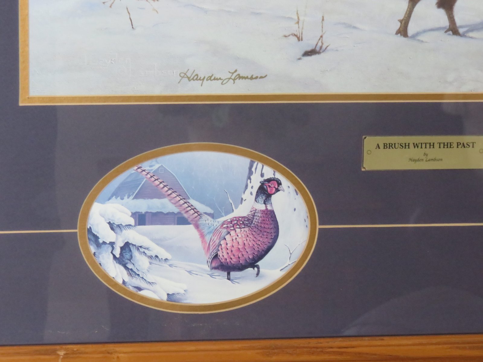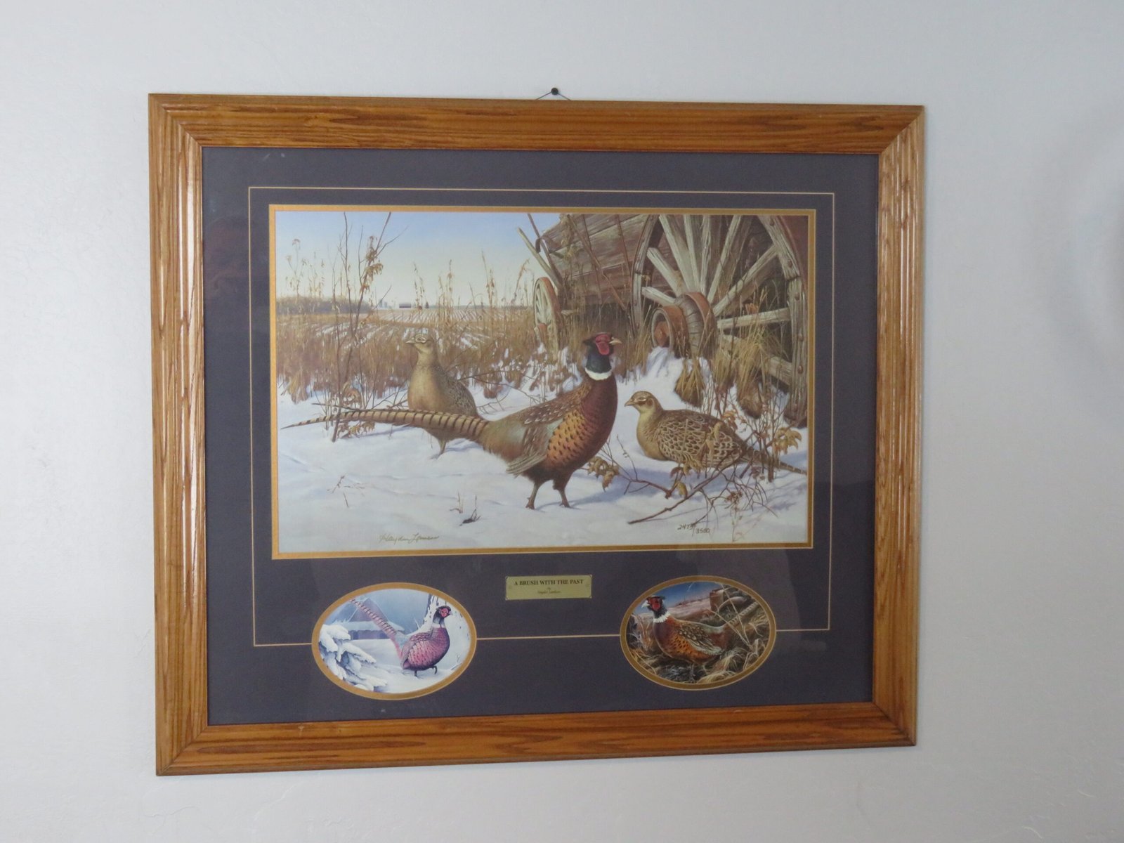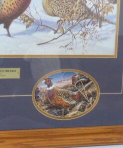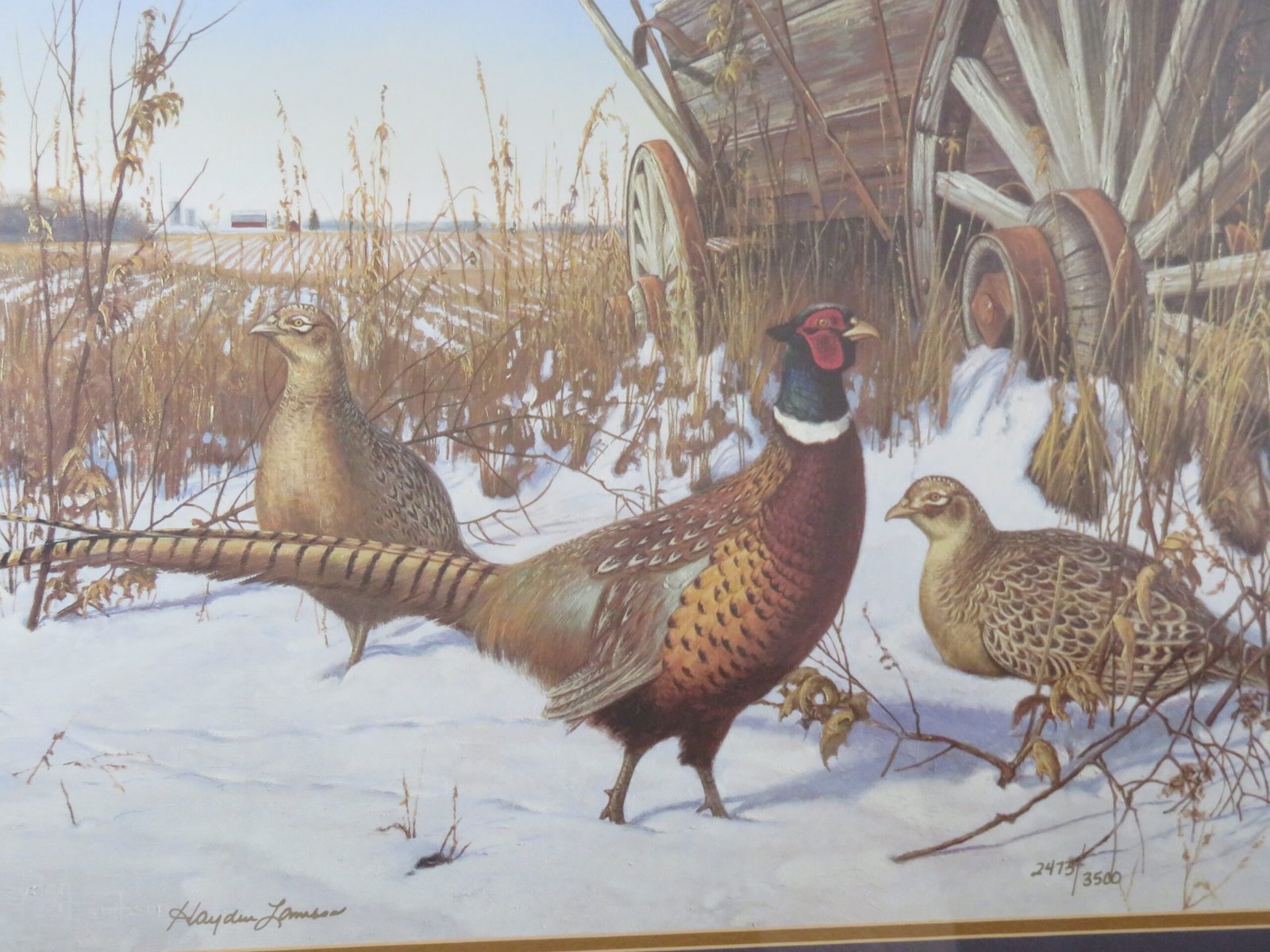 Hayden Lambson’s “A Brush With The Past.” The artist has signed and numbered this stunning Limited Edition print. #2473/3500. An antique wagon pulls up in a snow-covered field with pheasants. There are two smaller inset photos that also feature Ring-necked pheasant roosters in addition to this one.