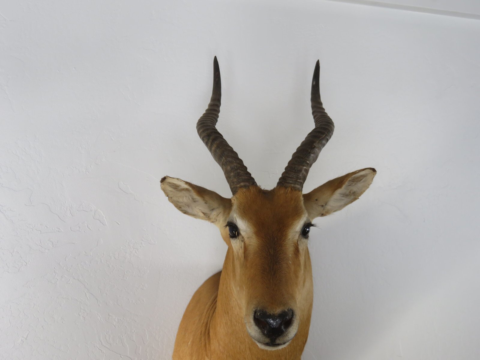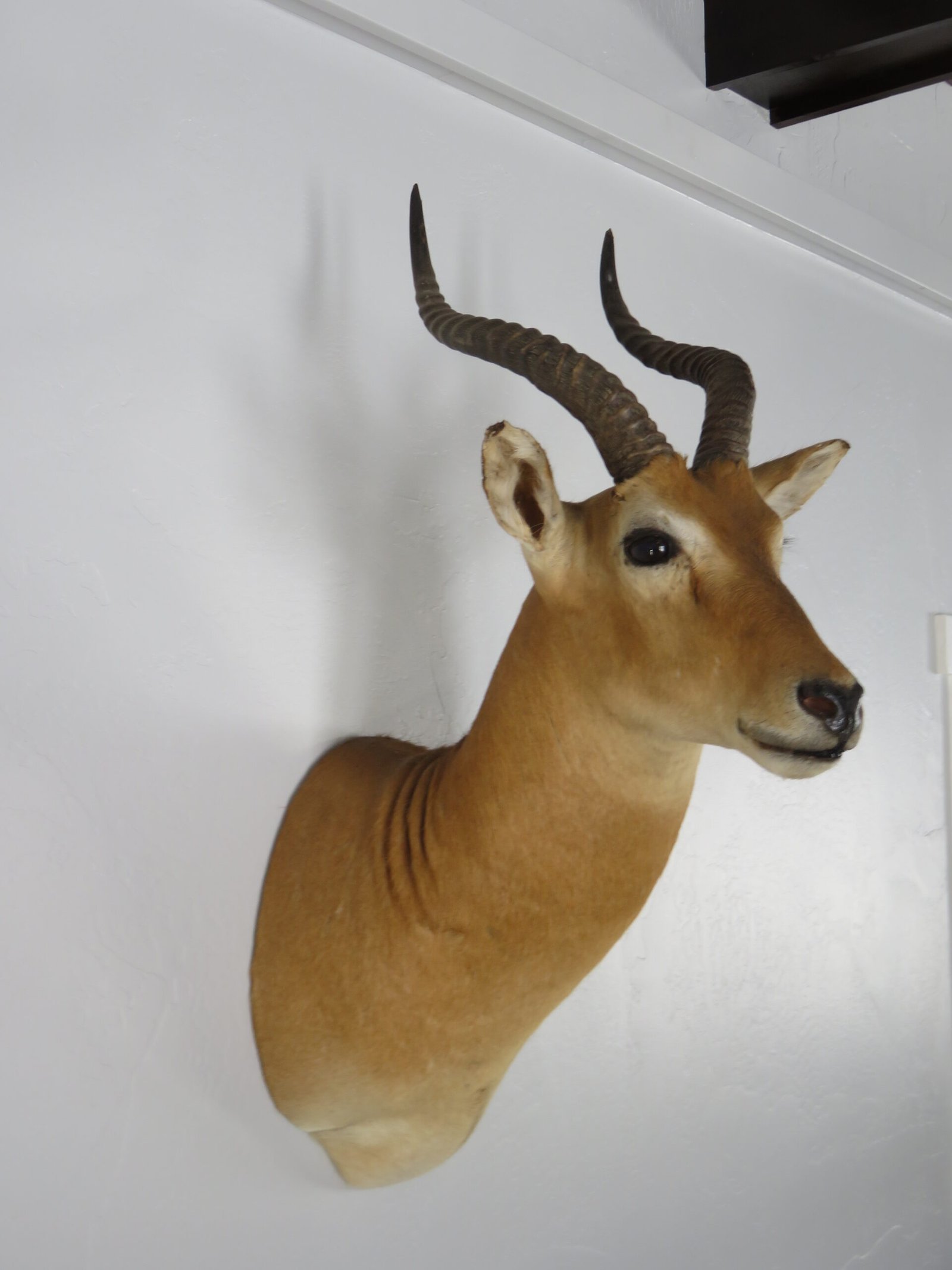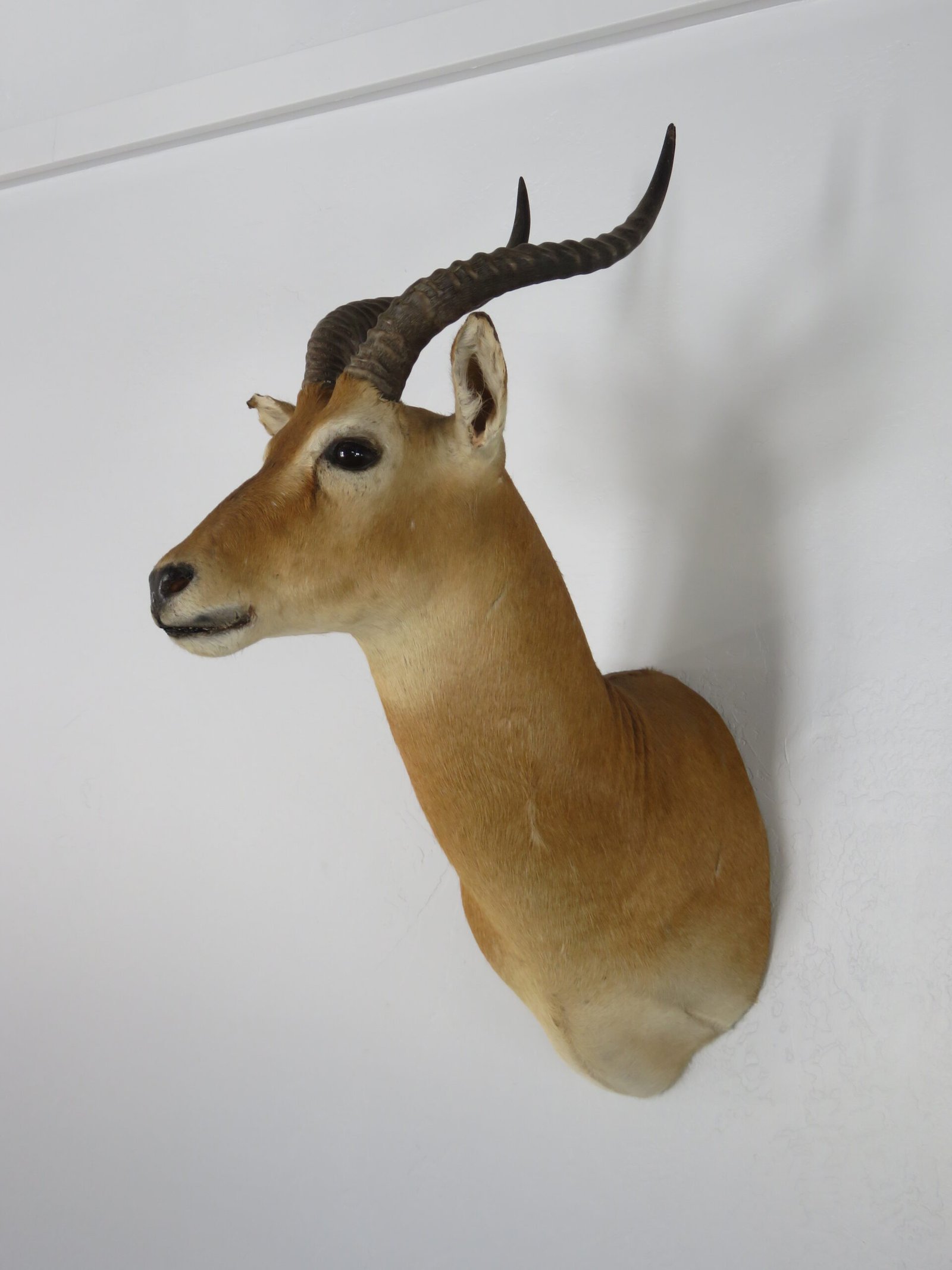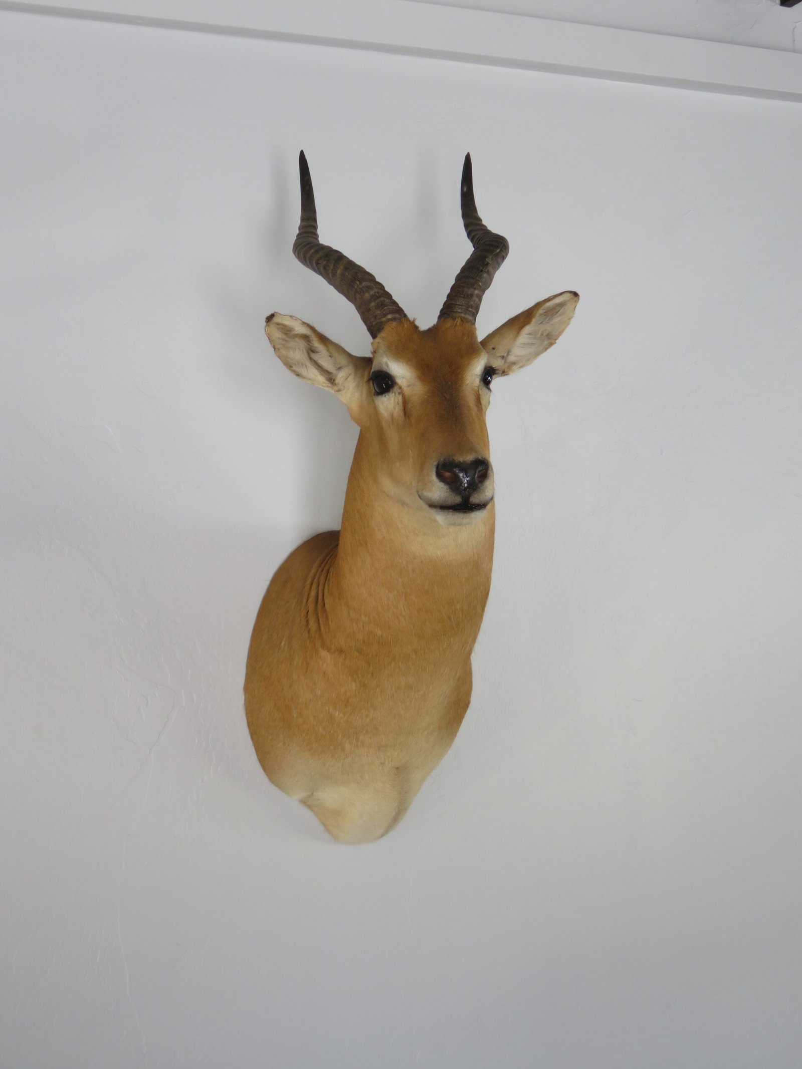 This African Puku shoulder mount can be displayed at a house, lodging facility, or place of business. The head of a taxidermy mount is raised and slightly turned to the right. 16 3/8″ and 16 4/8″ horn sizes are good. Each side’s base is 5 6/8″. With a total score of 44 3/8, he is exactly at the SCI Bronze Award categorization cutoff. We have rated this mount as “Excellent” due to its good horn size and nice craftsmanship.