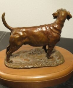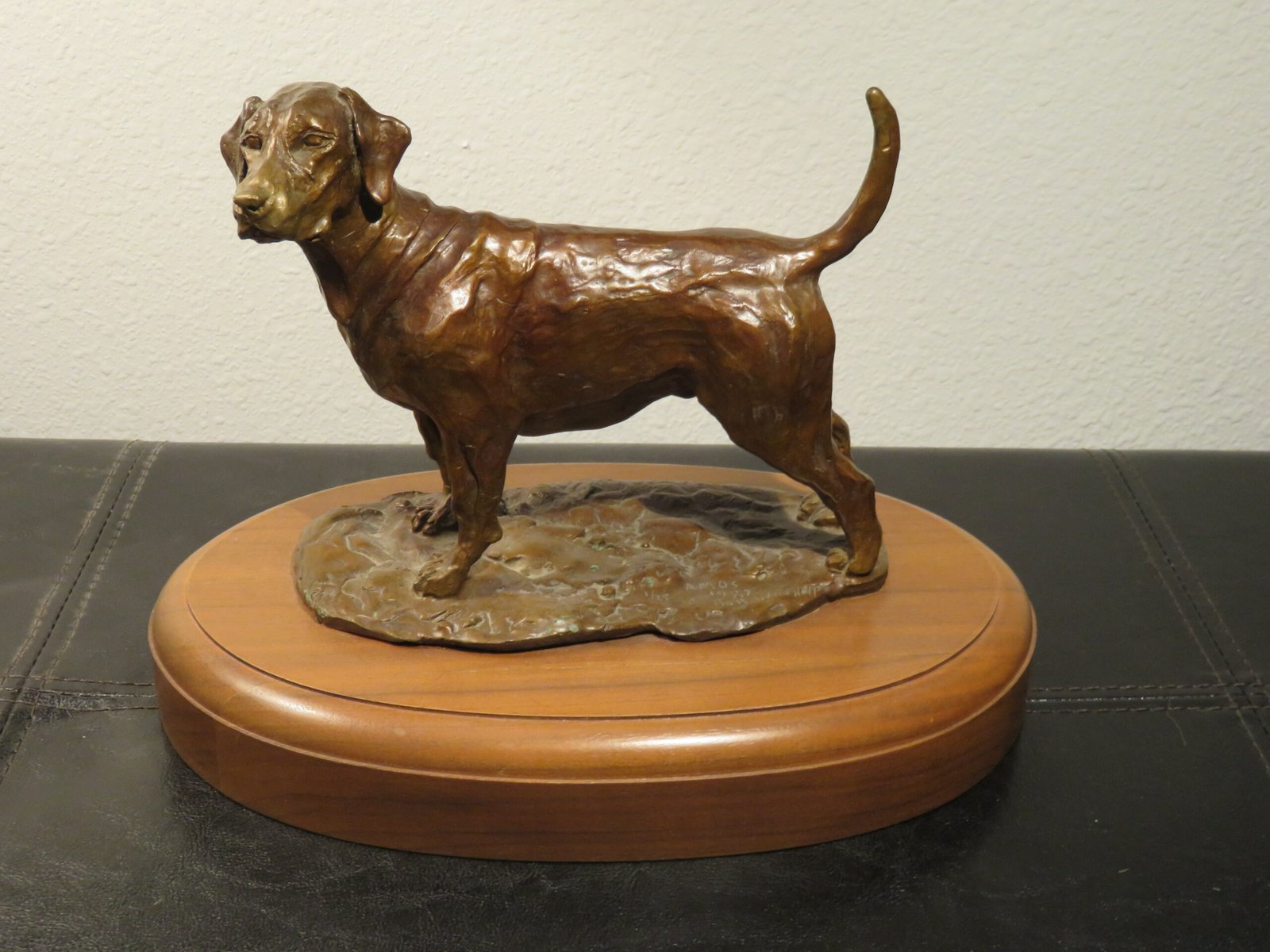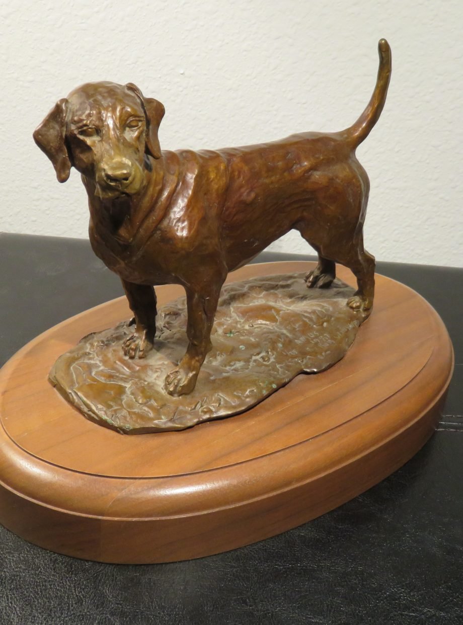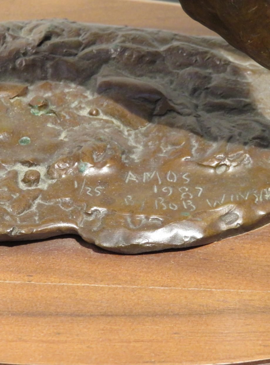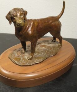 This is a fantastic bronze sculpture by Robert (Bob) Winship. It shows a gorgeous Labrador Retriever with its tail raised, standing alert. It is a solid bronze piece with an oval base (or plinth) made of magnificent wood and is titled “Amos.” The bronze piece with the number “1/25” is a fantastic collector’s item. It also has the title “Amos” and the date “1987 by Bob Winship.”