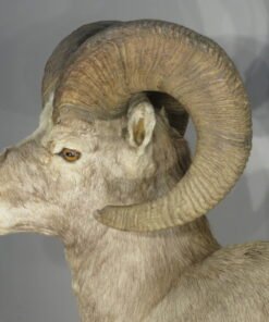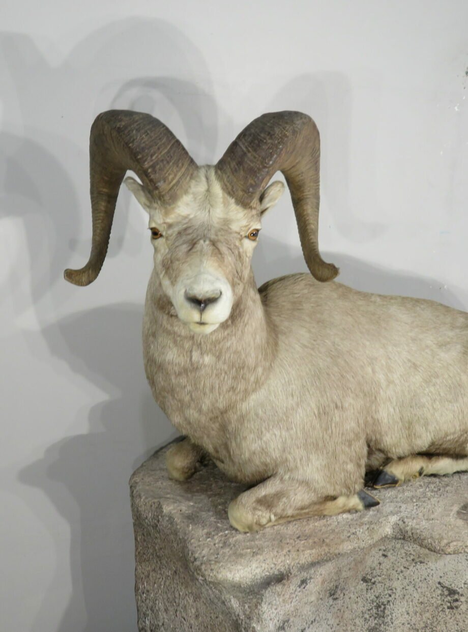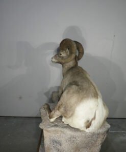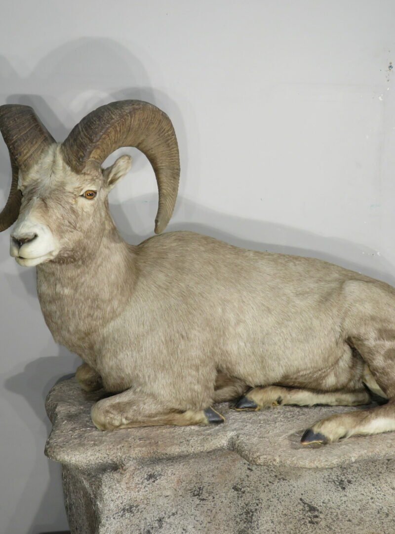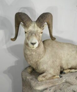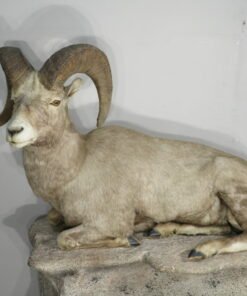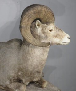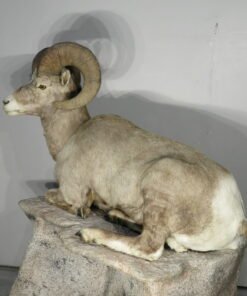 This is a stunning mount of an adult bighorn ram. The ram is in a wonderful, natural position with its legs folded under. He’s staring slightly to his left with his head up. With a raw score of 162 6/8, this male of the species has impressive horns. Excellent work is done in taxidermy. Ram can be set on the floor, a shelf, or a ledge, or on the terrain foundation shown (which is offered separately). This mount will be the focal point of any space or assortment. His skin is well-colored, and his hair is thick. Overall, this is a great example for anyone who enjoys one of the best animals in North America.