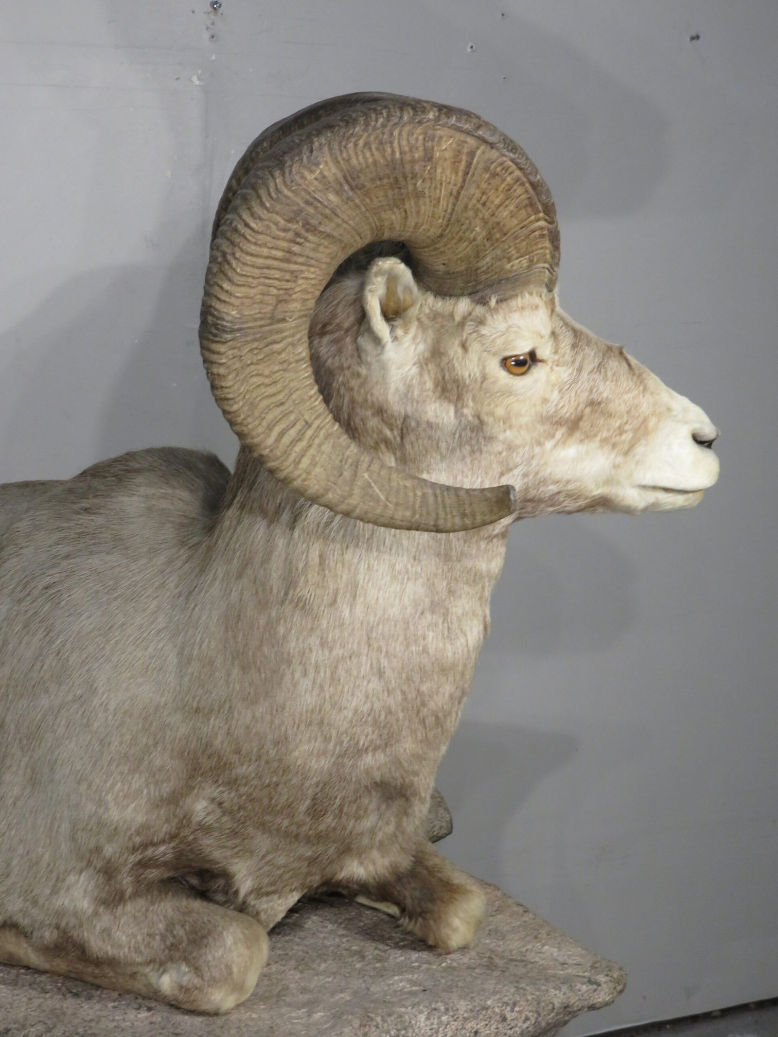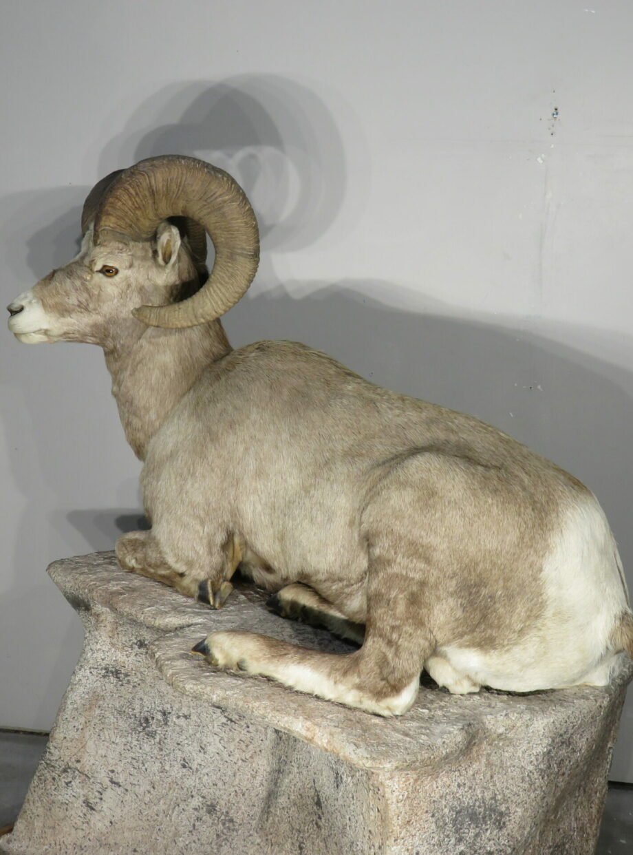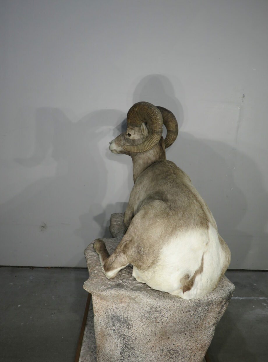 The total mount size (for sheep only) is 56 inches long by 27 inches wide by 27 inches deep by 33 inches tall. The mount can be placed on almost any level surface or on a bespoke display or stand. Observe that he is lying down with his back leg extended from his torso on a specially made “rock” base that suits his position. Refer to piece A-101BA (available separately). Purchase the taxidermy bighorn and base, and if you pay for them all at once and they can be shipped together, I’ll give you a discount.