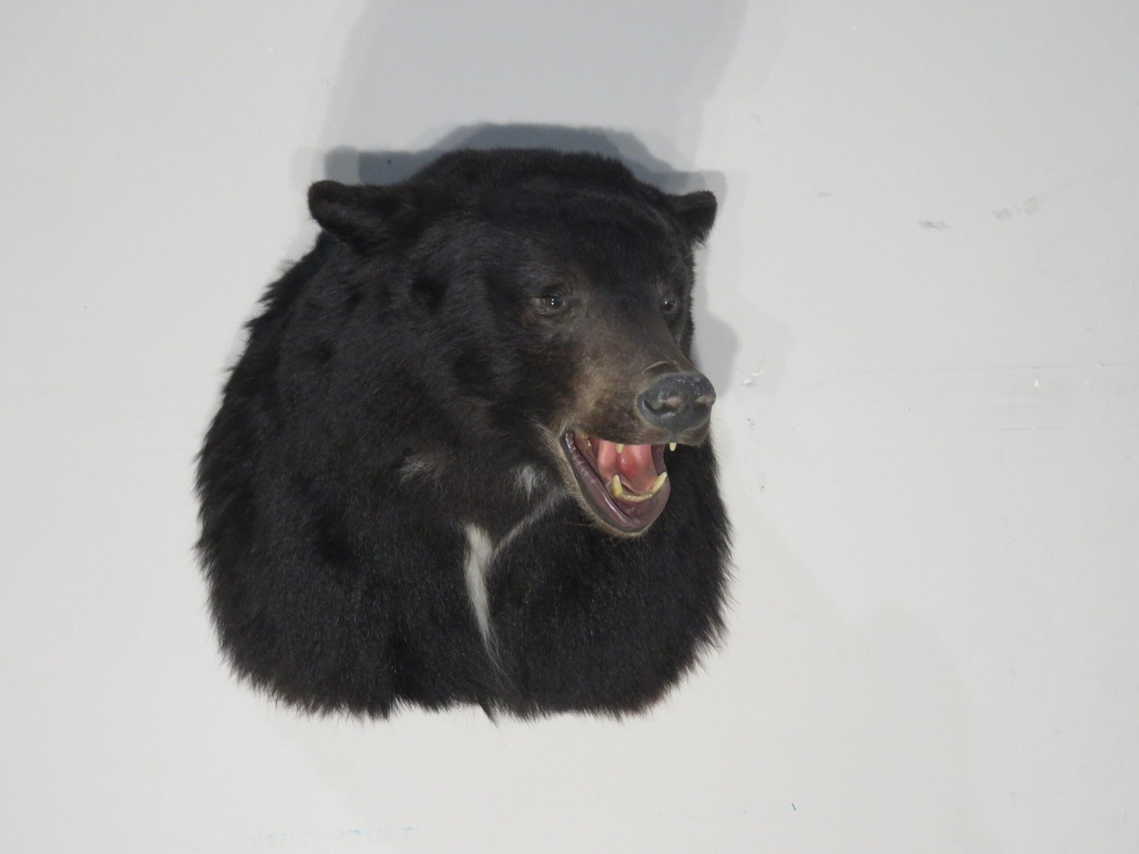 This is a lovely shoulder mount of a good-sized black bear. Mount turns slightly to the left and looks forward into the space. Mouth open. This is a fantastic piece for the collection of North American big game or predators because of its excellent black coloration and white blaze on the neck and breast. Alternatively, utilize this piece of taxidermy as a stand-alone piece in your house, cabin, lodge, or place of business.