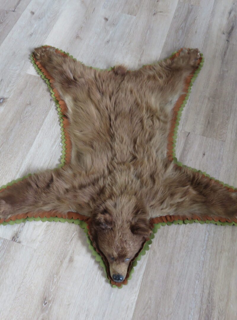 The mount’s overall dimensions are 42 inches long by 40 inches broad. Bears are about 36 inches long from snout to tail. liner made of double felt. was once a gorgeously crafted rug, but that was in the past. Please review every image to determine the item’s quality. Numerous skin fissures and even a loose chunk that has entirely separated from the object are shown in the attached images.