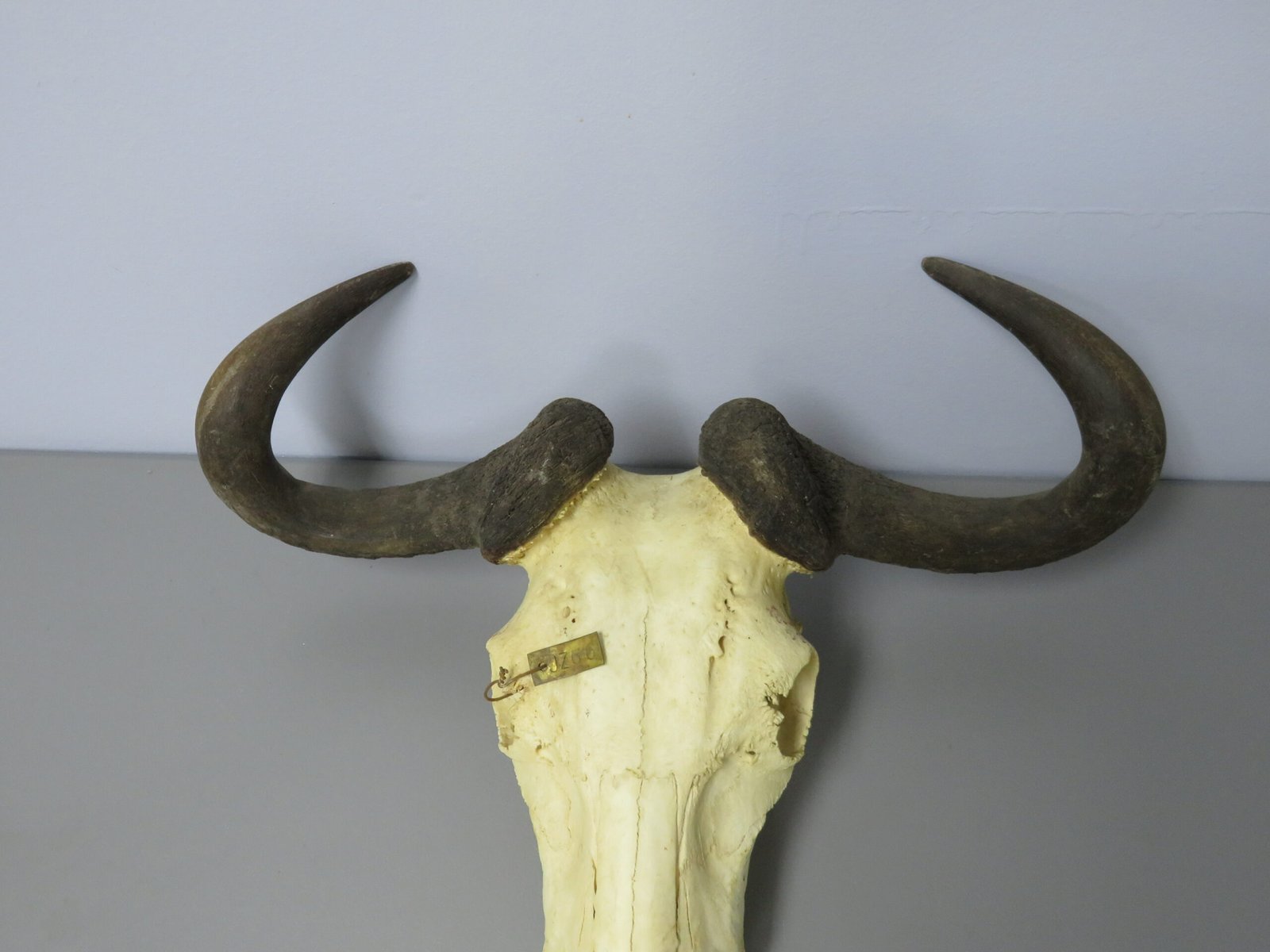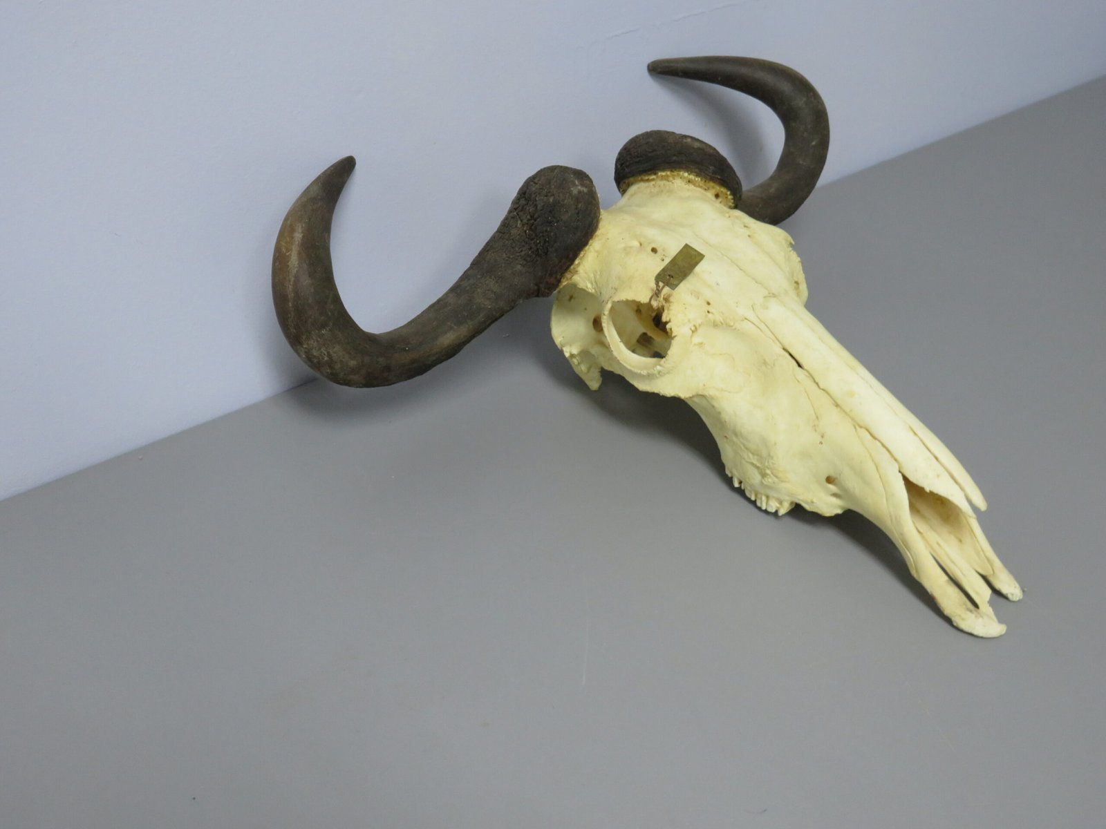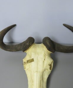 This is an African blue wildebeest mounted in Europe. This skull has good horn size, with horn diameters of 14 5/8 and 15 2/8 inches and lengths of more than 18 inches on each side. Overall in fair shape, albeit a little portion of the upper nose region is missing and the lower jaw is absent (see attached photographs). Other than that, it’s a lovely display piece that’s uncommon in the European finish.
