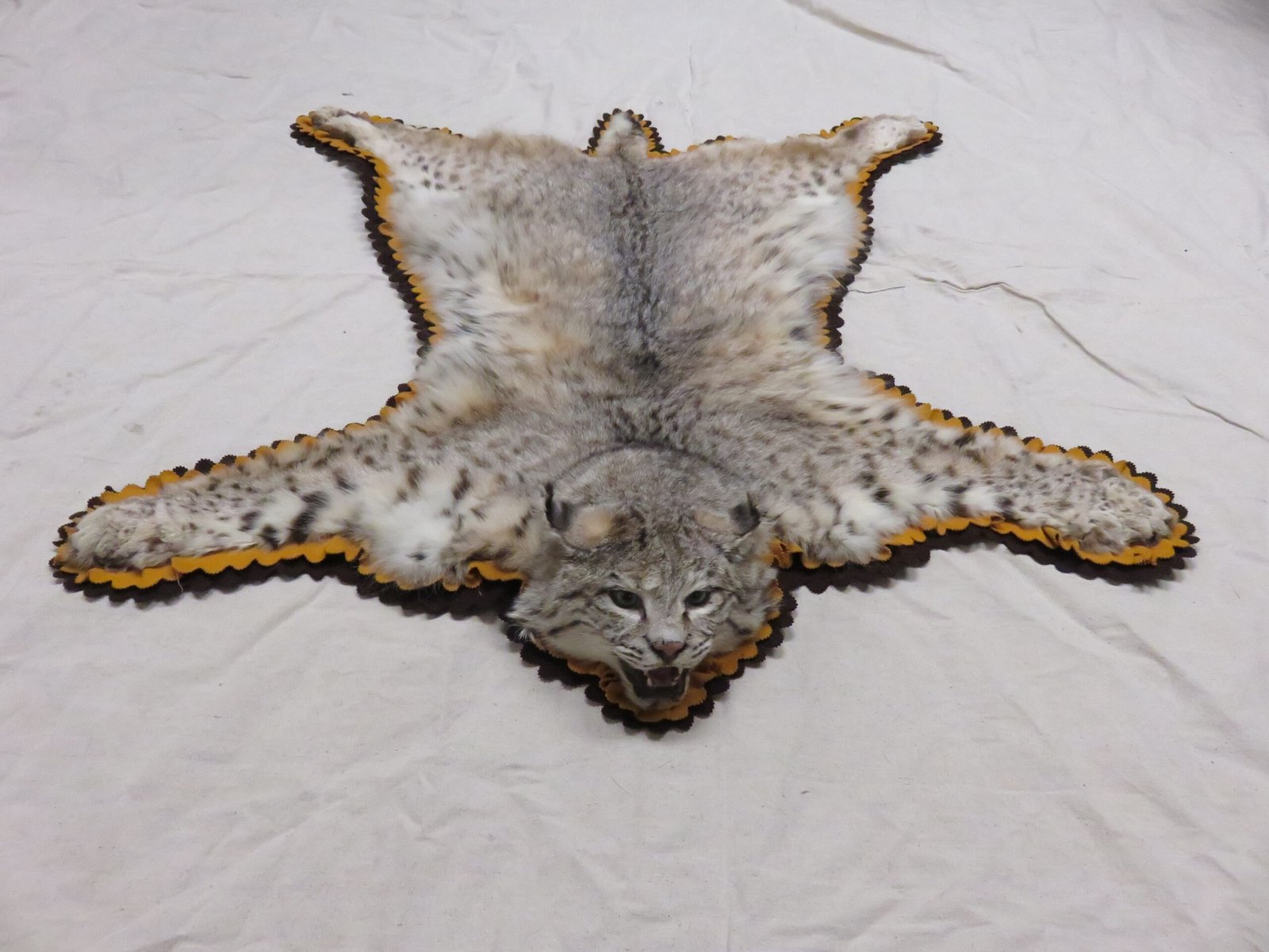 Any exhibit of North American predators and small game animals would benefit greatly from the addition of this taxidermy rug of a bobcat. The rug’s double lining of black and gold highlights the cat’s inherent color. (See the pictures attached.) An attractive sample with excellent color and hair quality! would rest on a floor, table, or hang on the wall. Although it was a very lovely rug, we did give it one grade because it was rather abrasive to the ear. Thus, we gave this Bobcat a Nice grade.