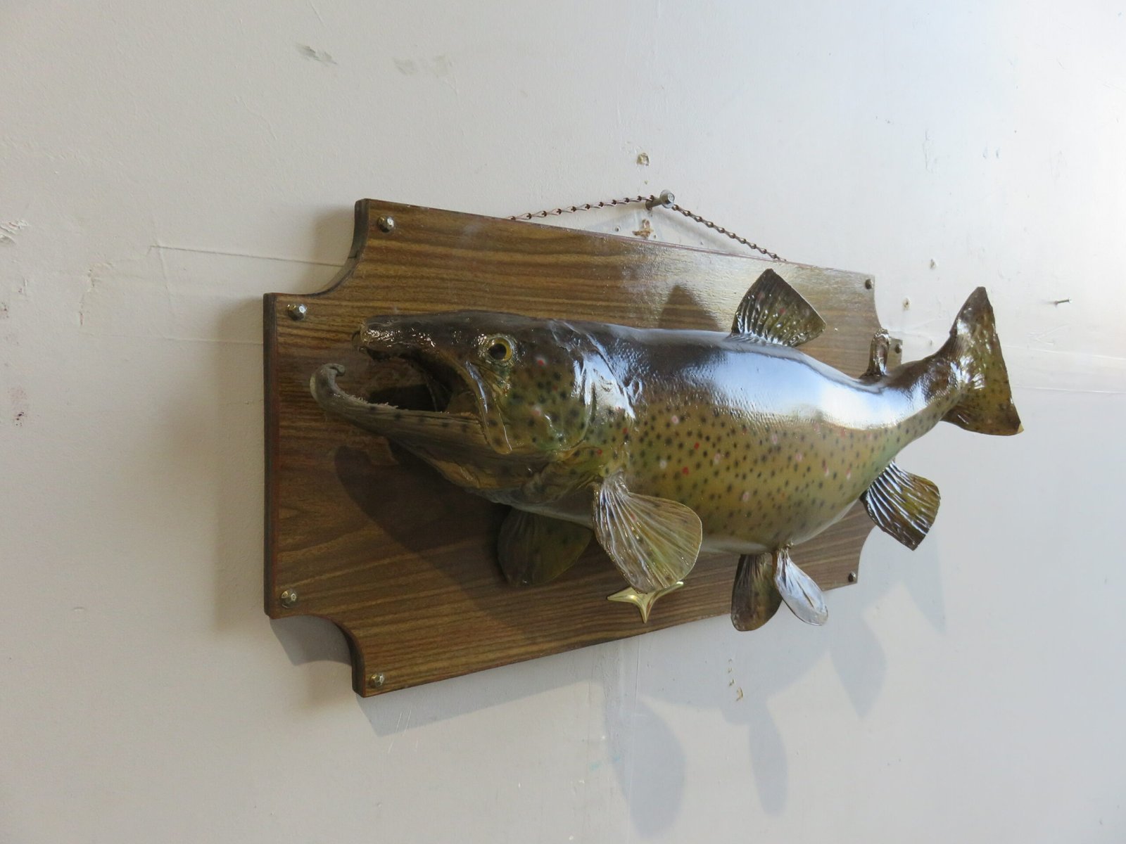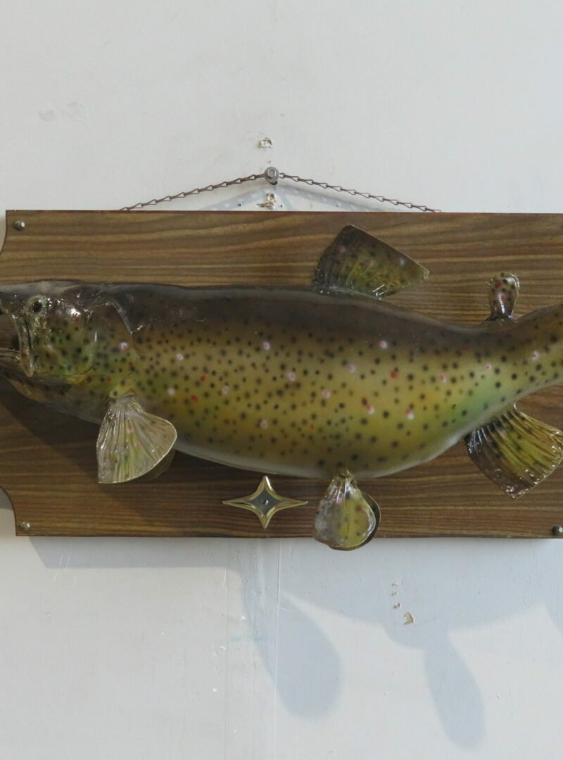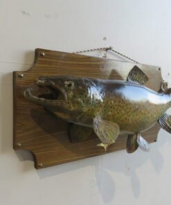 The total mount dimensions are 13 1/4 inches high by 27 1/2 inches long. A lovely antique taxidermy piece with a background of brass décor and an antique plaque. Include this trout in a collection of North American fish or purchase it to put on display in the lodge, cabin, house, or workplace.