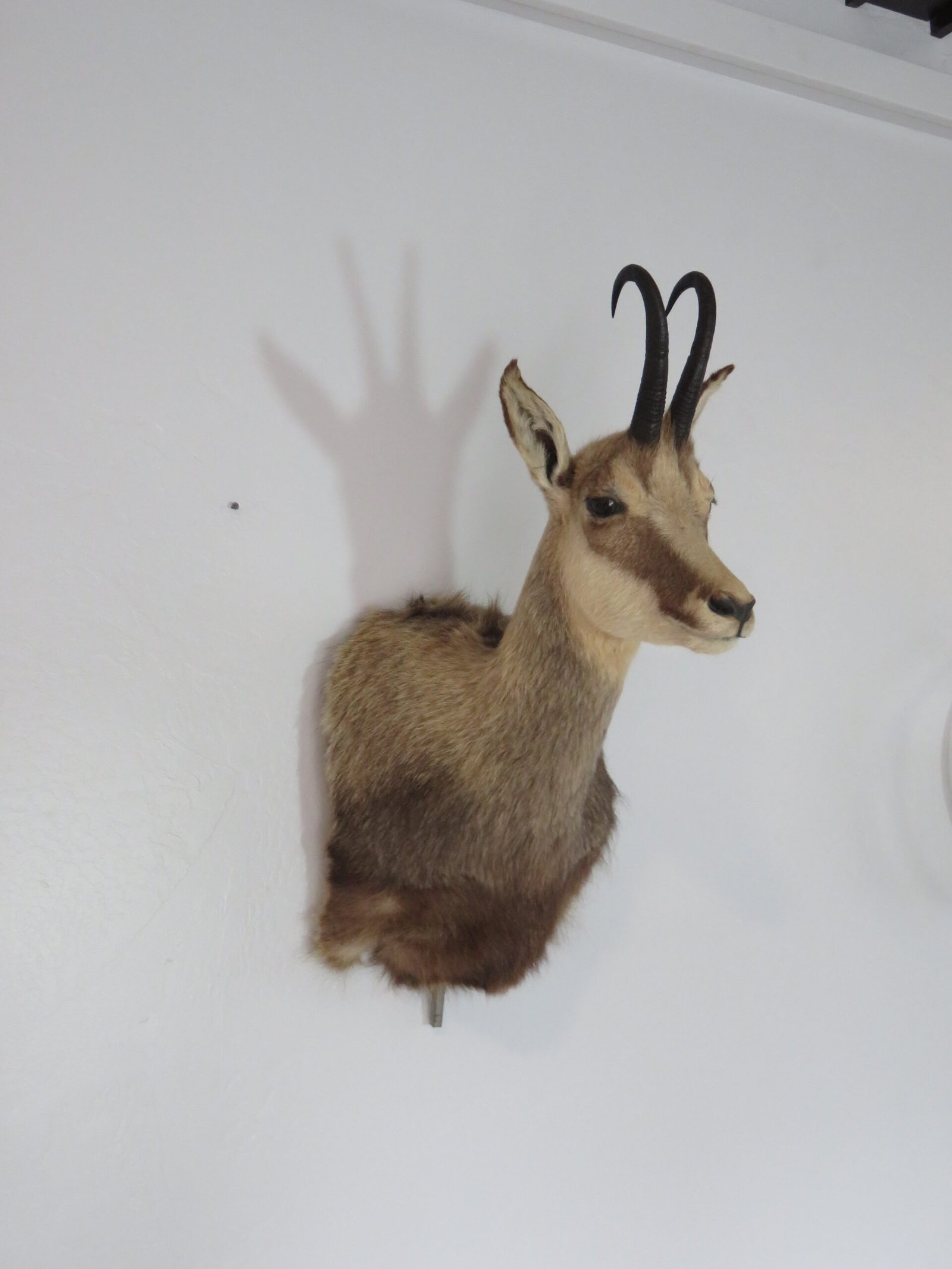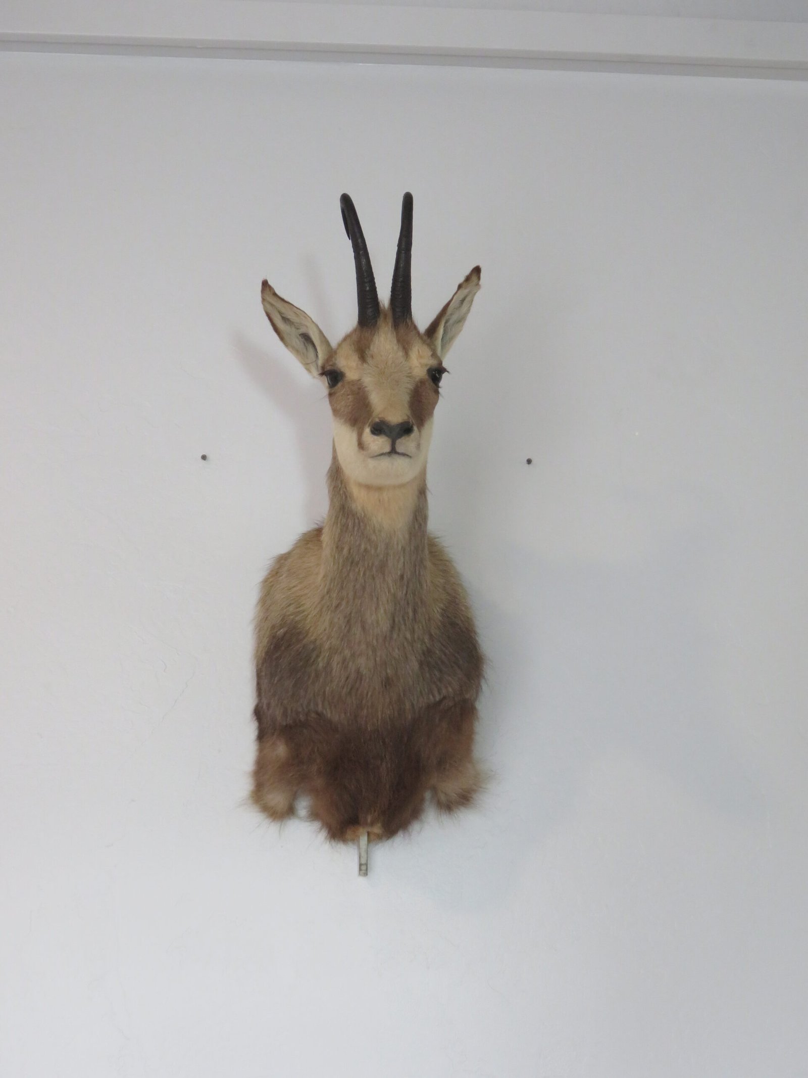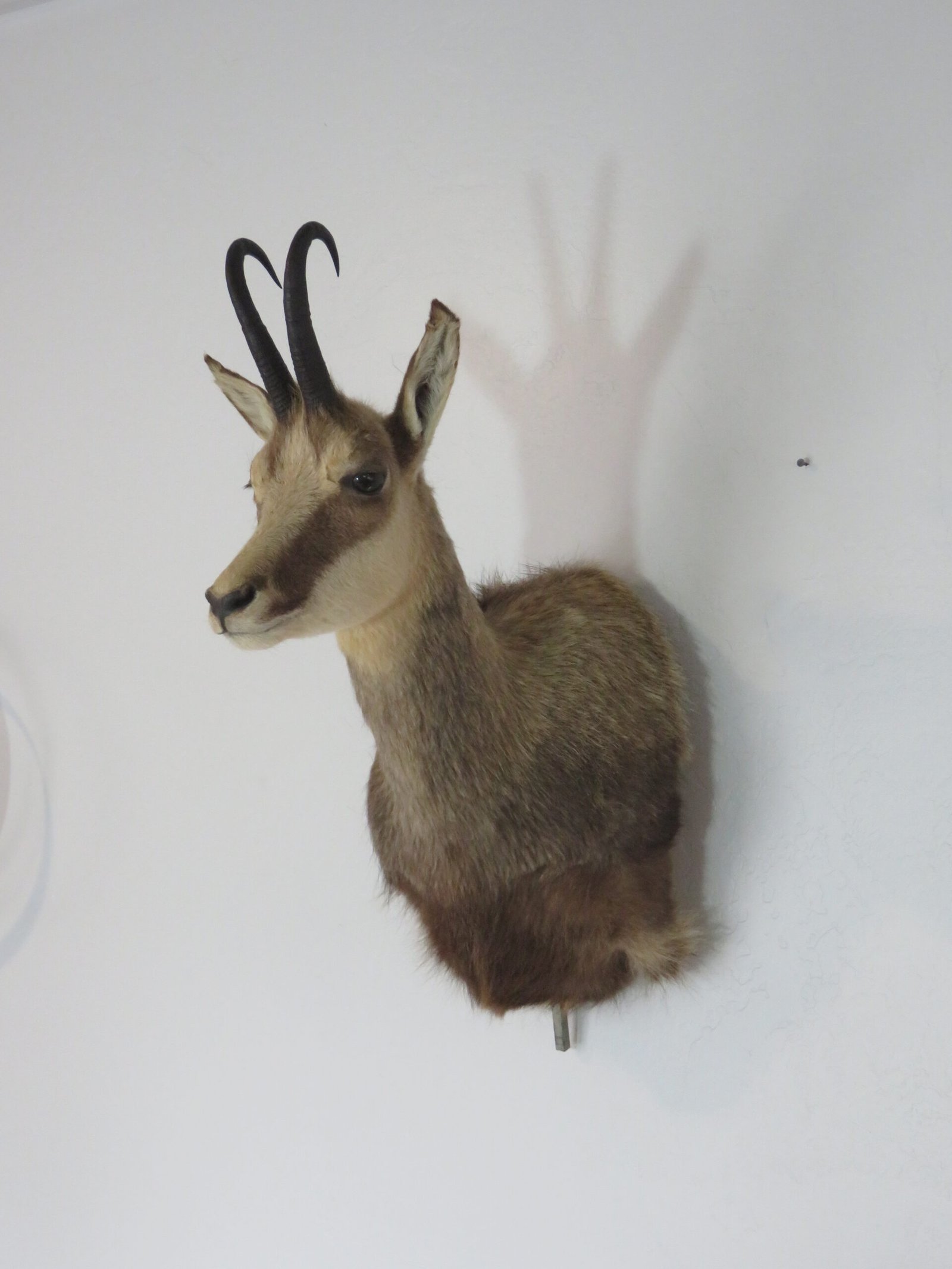 This mount is a Chamois shoulder mount that can be exhibited on a pedestal base or hung on the wall. (See the pictures attached). There is no base included. In a head-up, forward-facing position, this species has a nice representative with average horn sizes.
