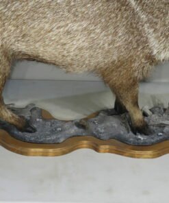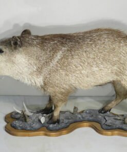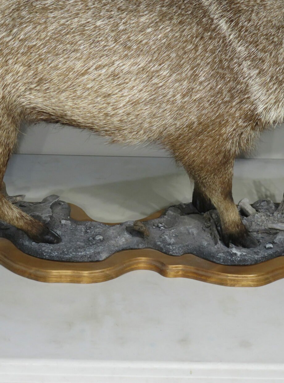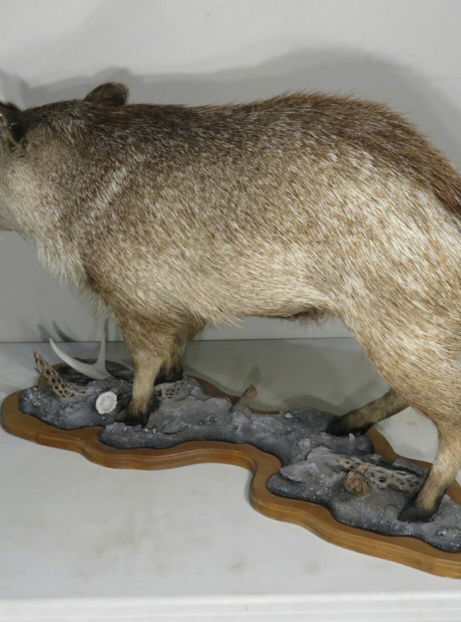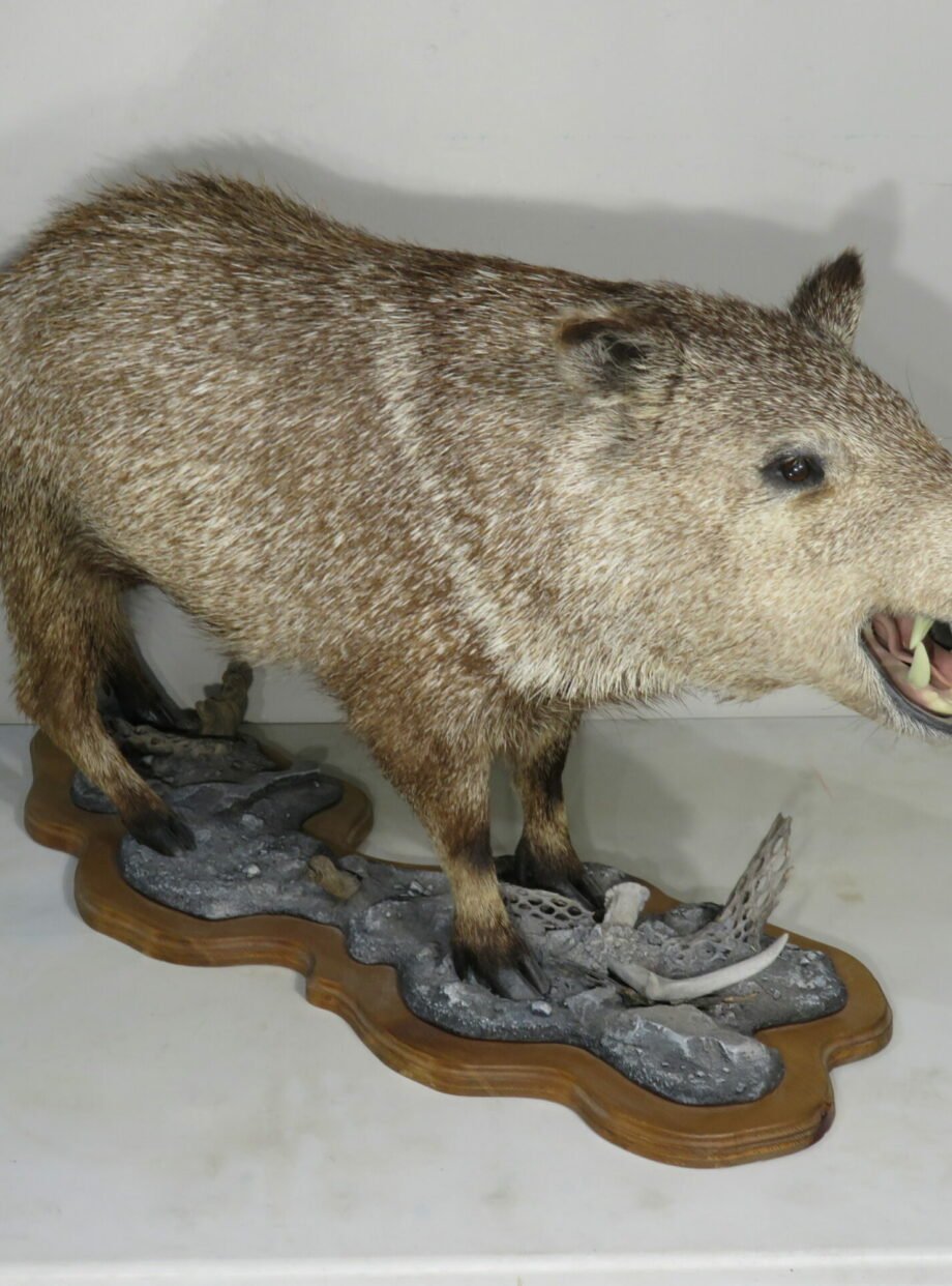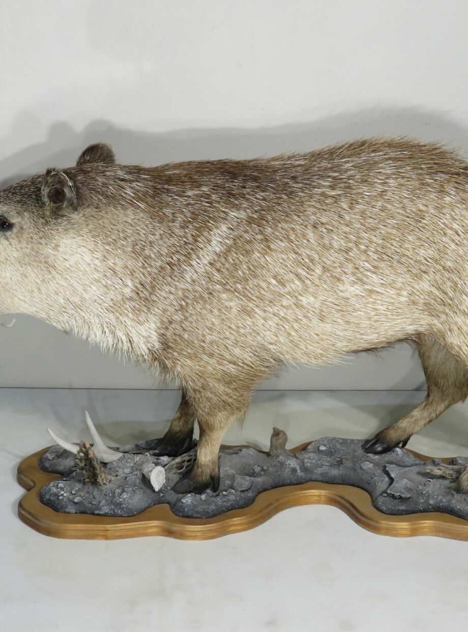 This is a rare life-size mount of a collared peccary. These little wild pig species, also referred to as “Javelinas,” are found throughout the southern and western regions of the United States. This mount is attached to a detailed landscape base and has a natural stance. Although the mount would receive a higher rating, the tips of the ears have some small damage (see attached photographs). This mount has an open mouth finish so that the tusks may be appreciated while it is walking.