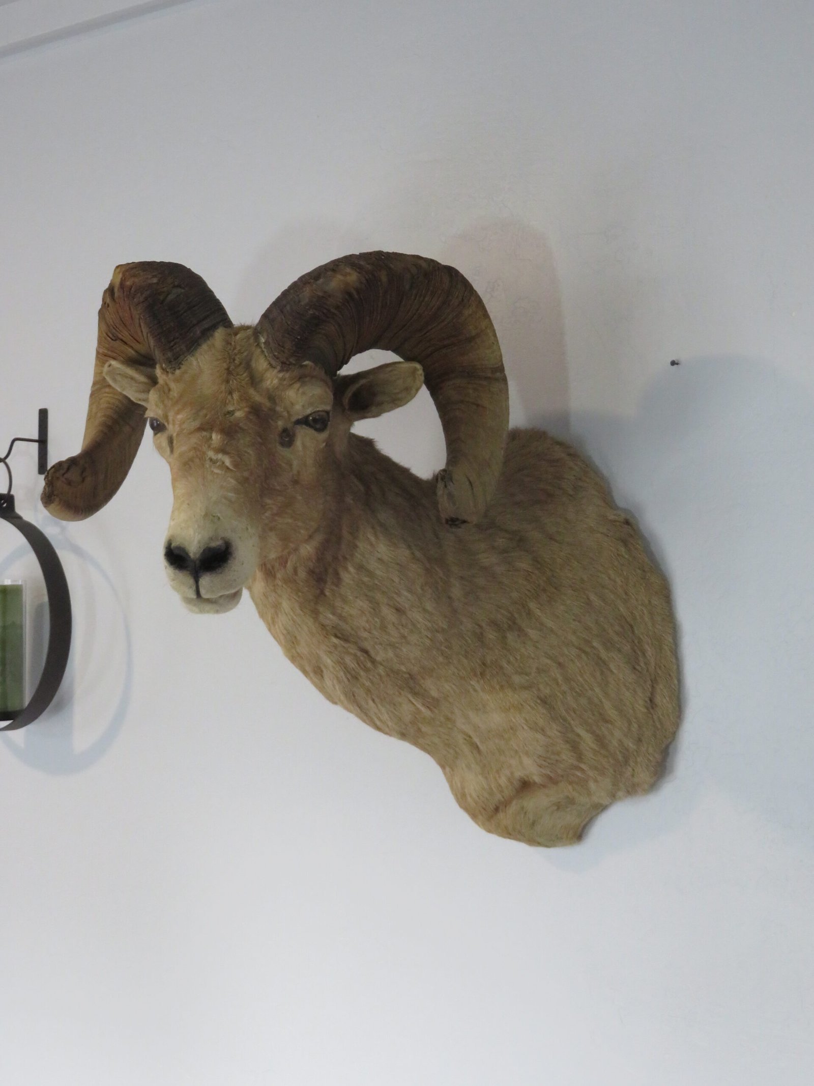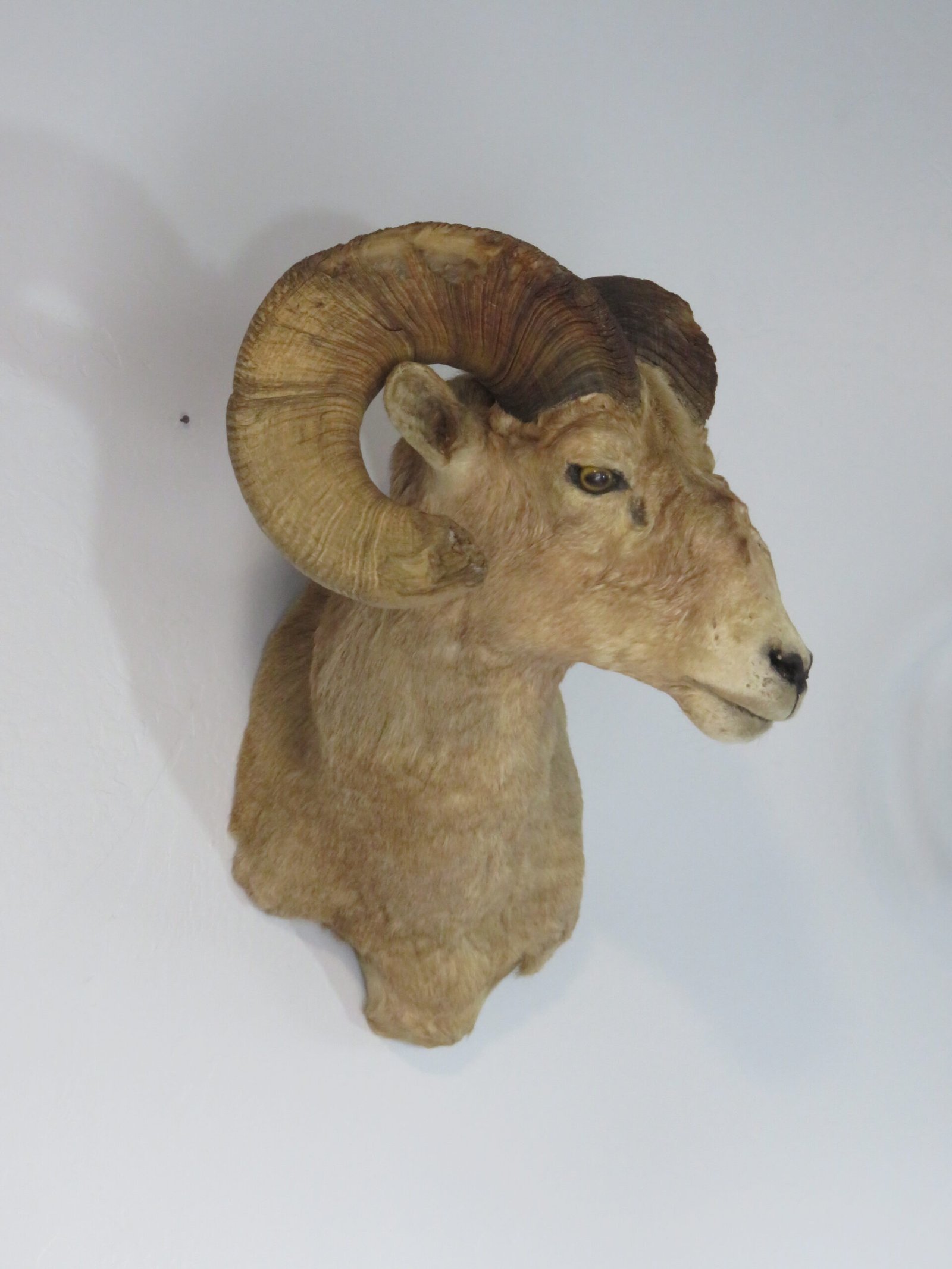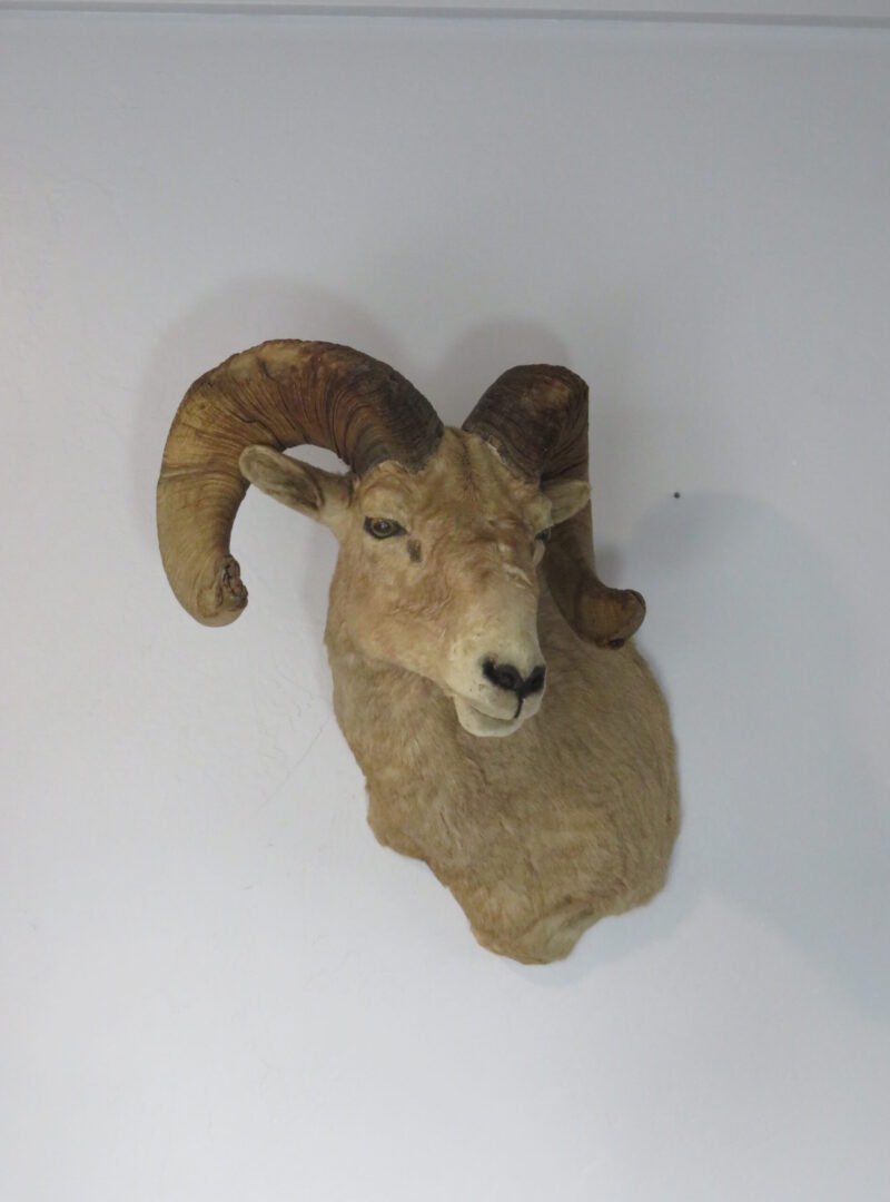 This gorgeous Desert Bighorn ram is up for sale. With a turn to the ram’s left and an eye toward the room, this shoulder mount strikes a nice pose. Hair thickness and color are good. solid set of horns with a total mass of approximately 143 inches. There are several battle scars on the horns, including chipping and brooming. (See the pictures attached).