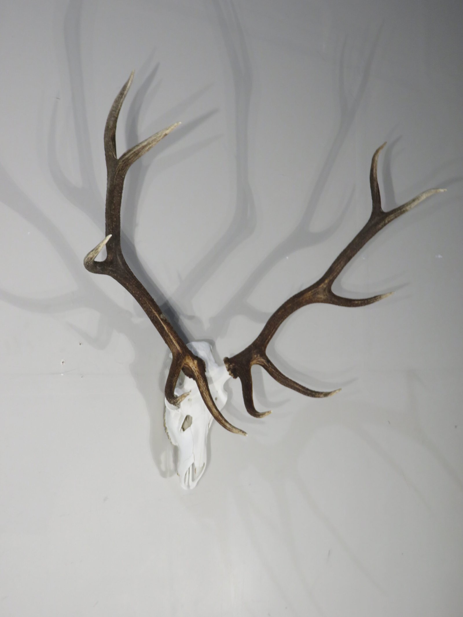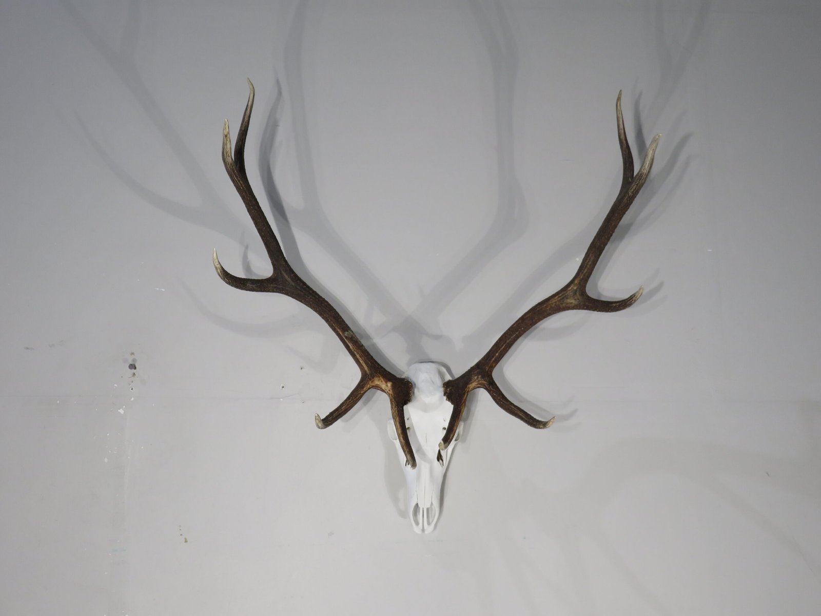 A stunning European mount of a Rocky Mountain Elk. skull with five points on each side that has been expertly cleaned. Nice tine lengths and dark-colored antlers. Bull is an Idaho native. Purchase this taxidermy to put on display in the office, mancave, cabin, or lodge. Please take note that the skull has a missing part and a break (see all attached photographs).