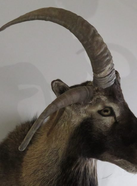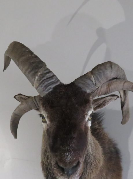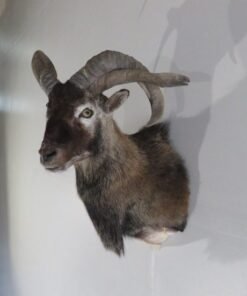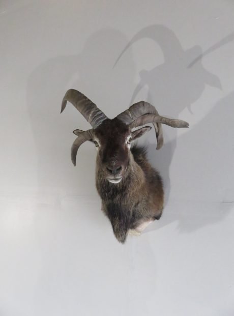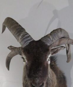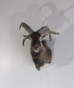 This is a shoulder mount of a Jacobs ram or sheep with four horns. The color and hair of this sample are excellent. A fantastic set of horns, too! To appreciate the head gear on this unusual variety of sheep, view the accompanying photographs. He is staring to his left while keeping his head up.