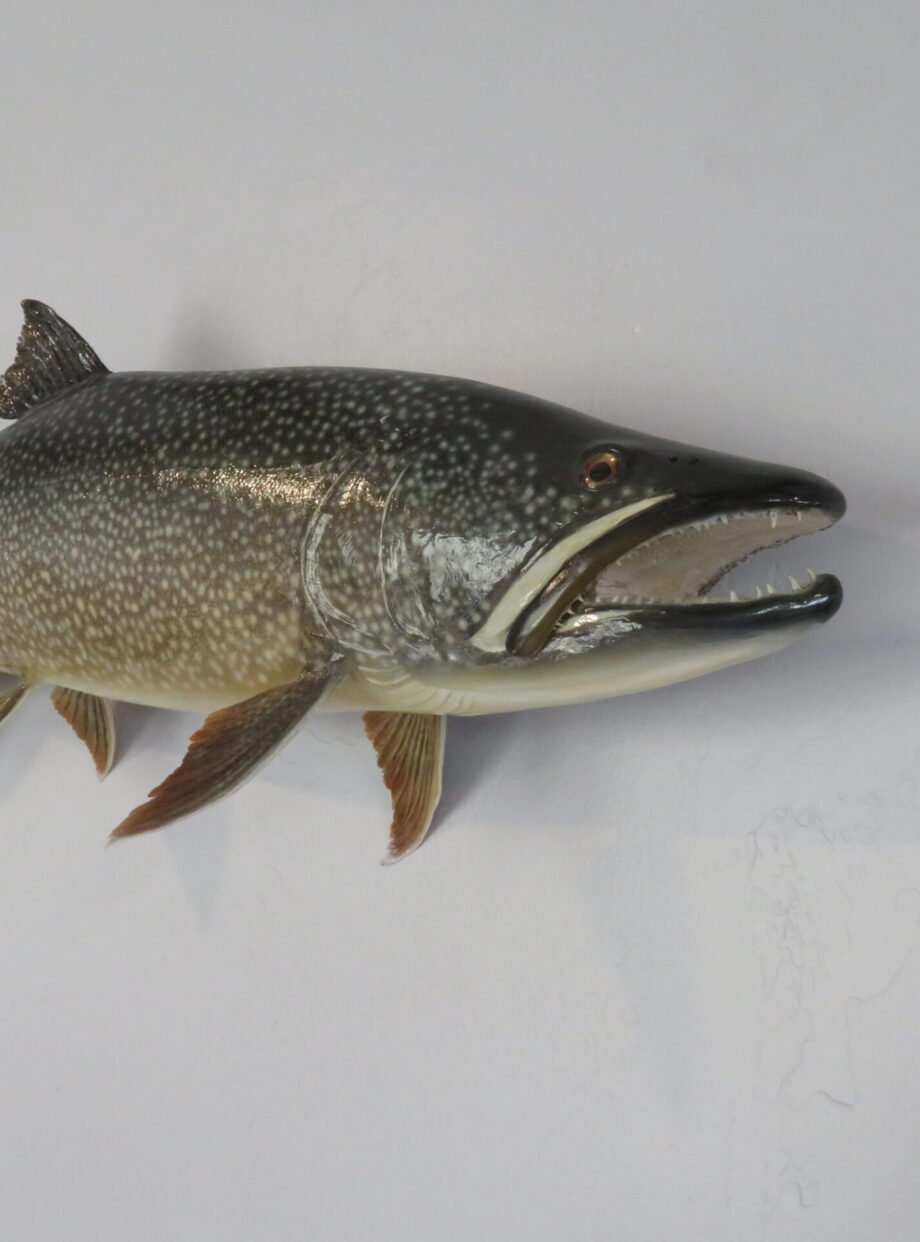 This is a real-skin mount of a lake trout. When this fish was captured, it weighed precisely twenty pounds. The whole length is 35 inches. With the head facing the audience directly along the wall, the body is bent in a swimming action. Excellent for the mancave, office, lake home, or resort.