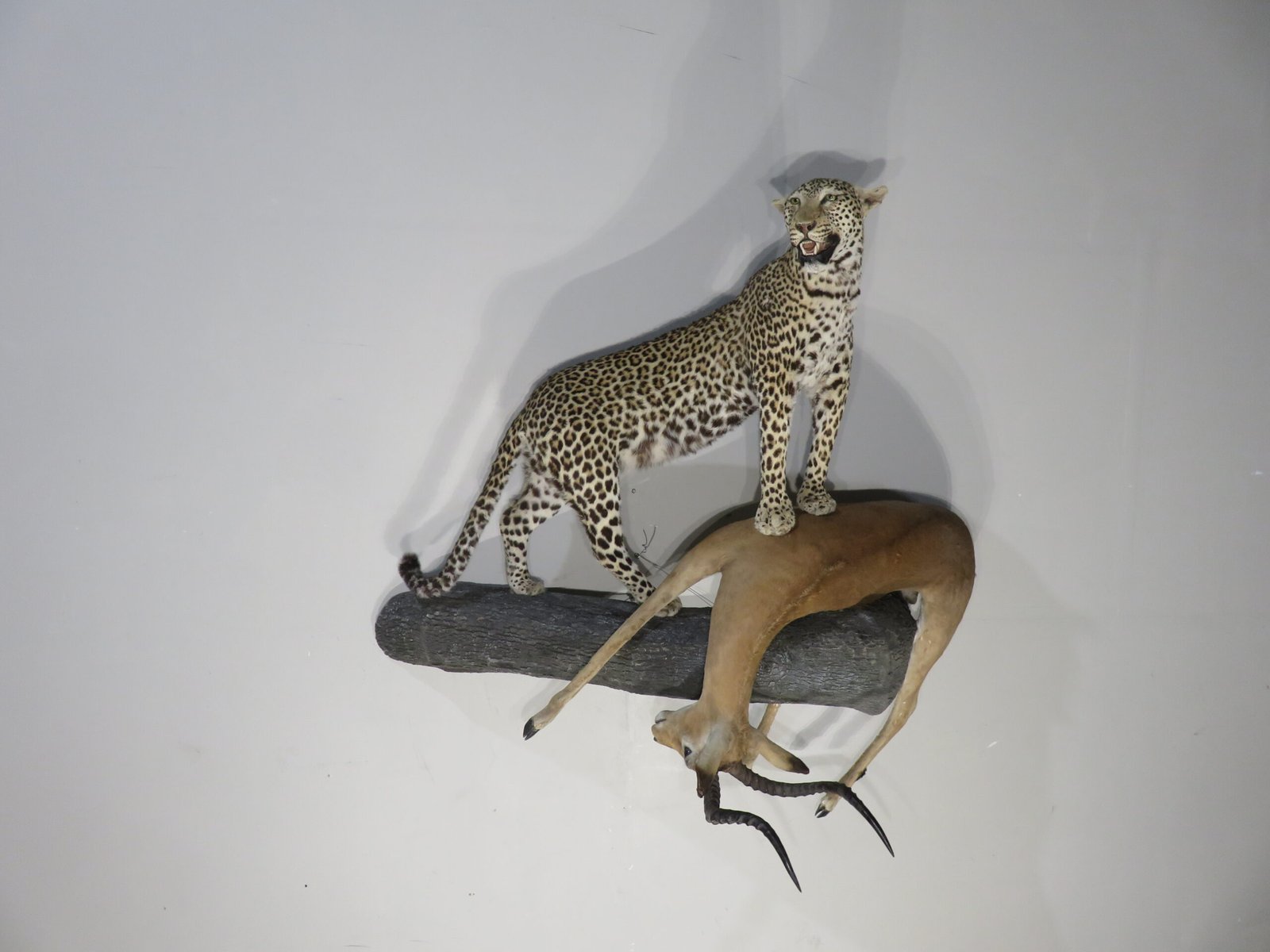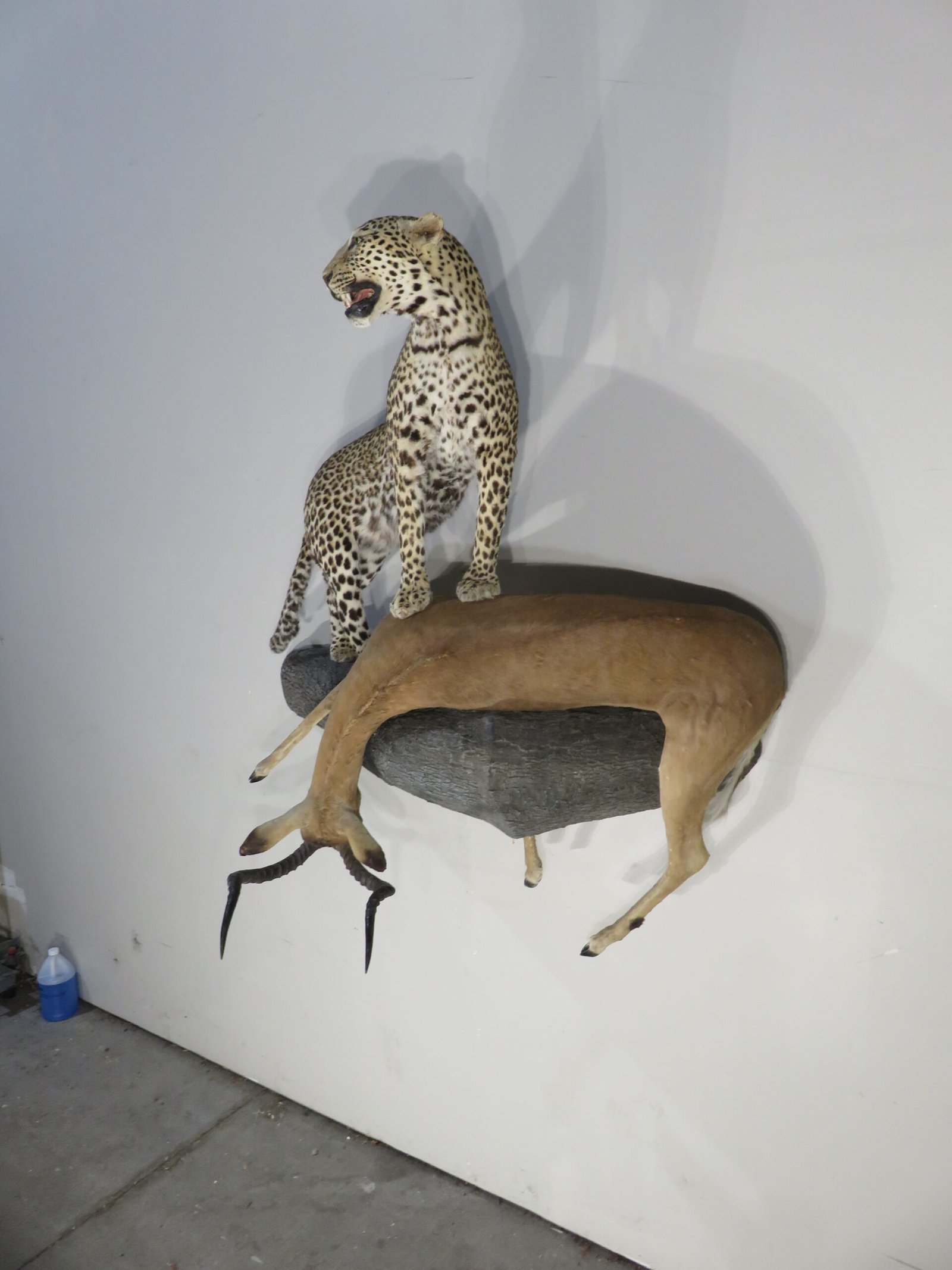 Leopard Taxidermy For Sale is a showroom mount for serious African/exotic big game taxidermy collectors! In any context and with any collection, this stunning piece will draw attention. The big leopard that stands with its front feet on the prize is the main focus of this mount. A giant African impala that is draped over the big “log” that serves as the wall mount’s foundation is the prey in this scenario. Measuring almost 69 feet tall and 70 feet broad, this wildlife exhibit is really breathtaking. The distance from the wall to the room is 44 inches. This piece of taxidermy is of premier quality. It can only be marketed in Montana because of the species involved.