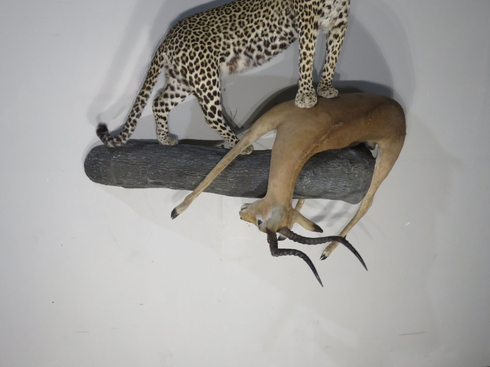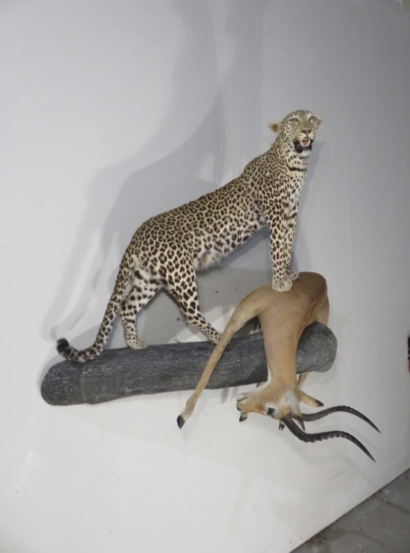 Taxidermy Leopard For Sale From snout to tail, the leopard is around 53 inches long. On the front shoulder, there is a tiny hole in the shoulder. If the owner wants to hide it, it can be colored in. It appears as a tiny white spot. Additionally, the impala’s hide includes a few rub spots that give the mount a more genuine appearance, as though the leopard had truly dragged it into a tree. (See the pictures attached.)