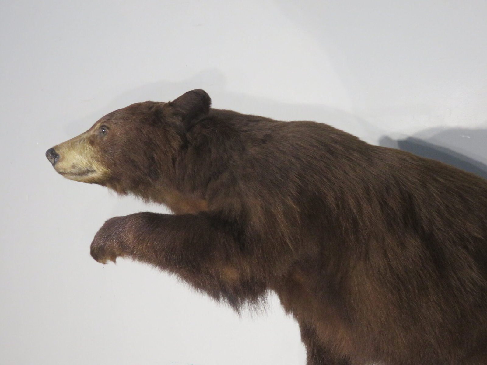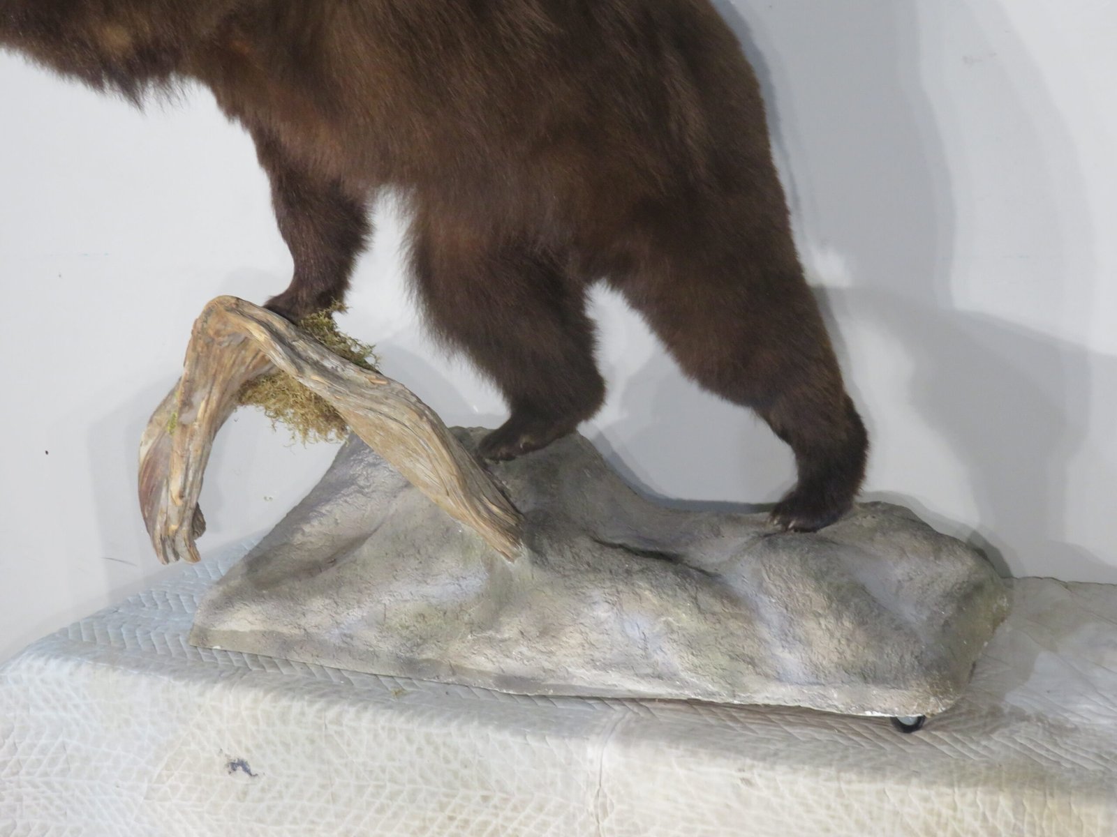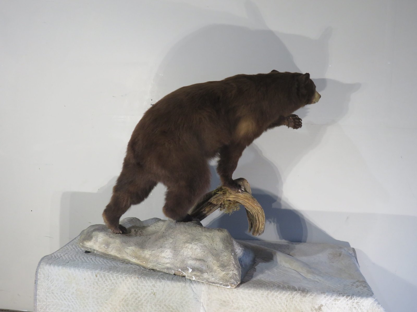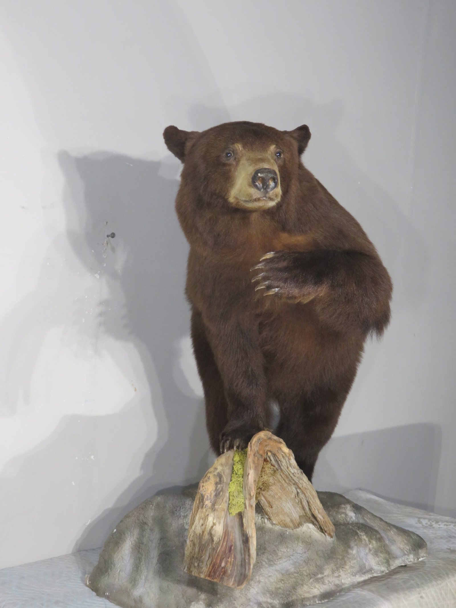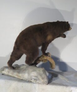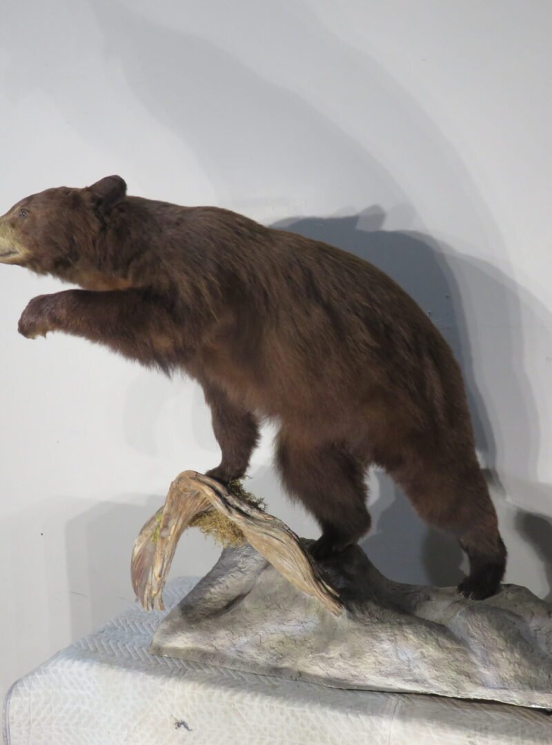 This life-sized, attractive black bear mount is for sale. Bear has a consistent chocolate color and is reddish-brown. The entire mount has good, thick, long fur. Balancing on a wood and rock terrain base while striking a nice stance with one paw up. For collectors of large game and predators in North America, this would be an excellent showpiece.