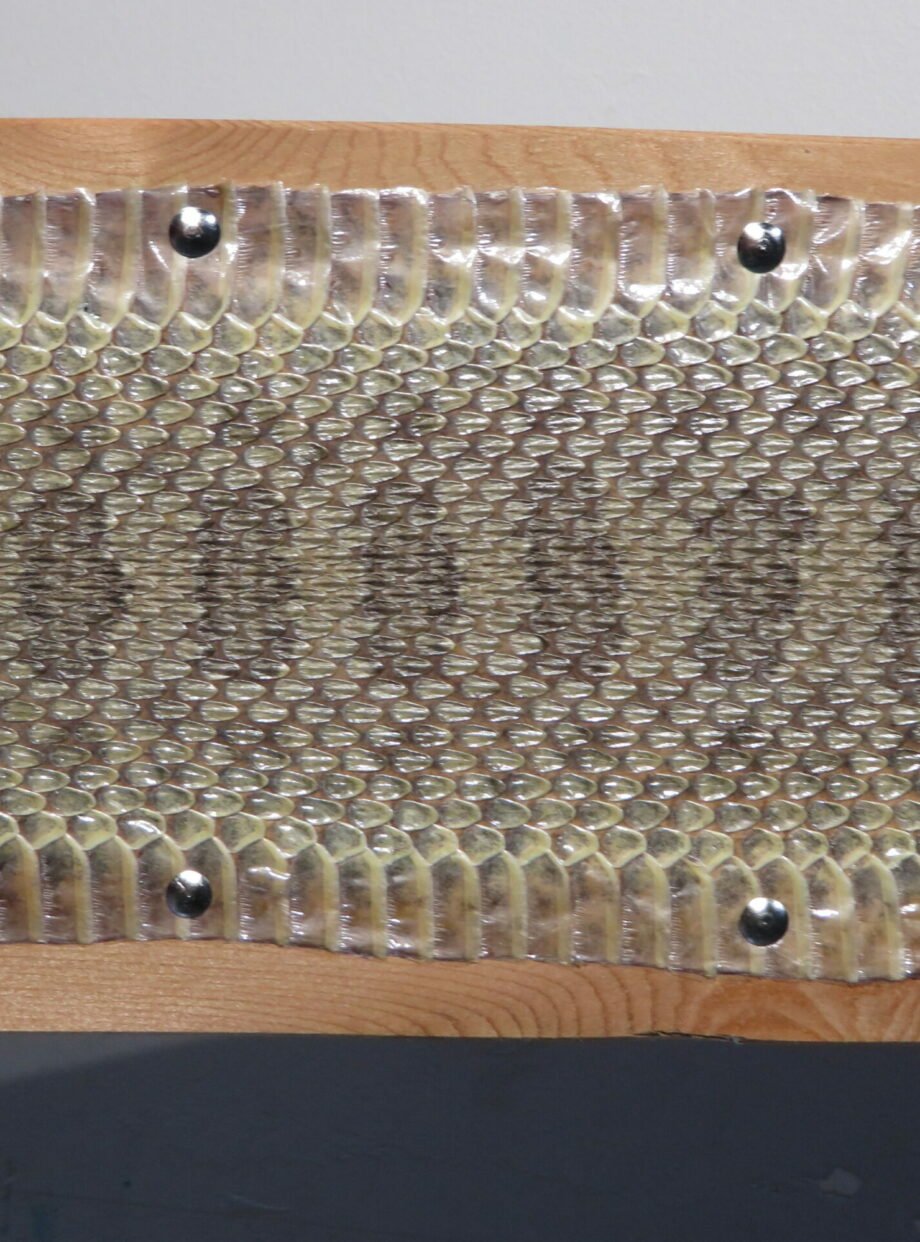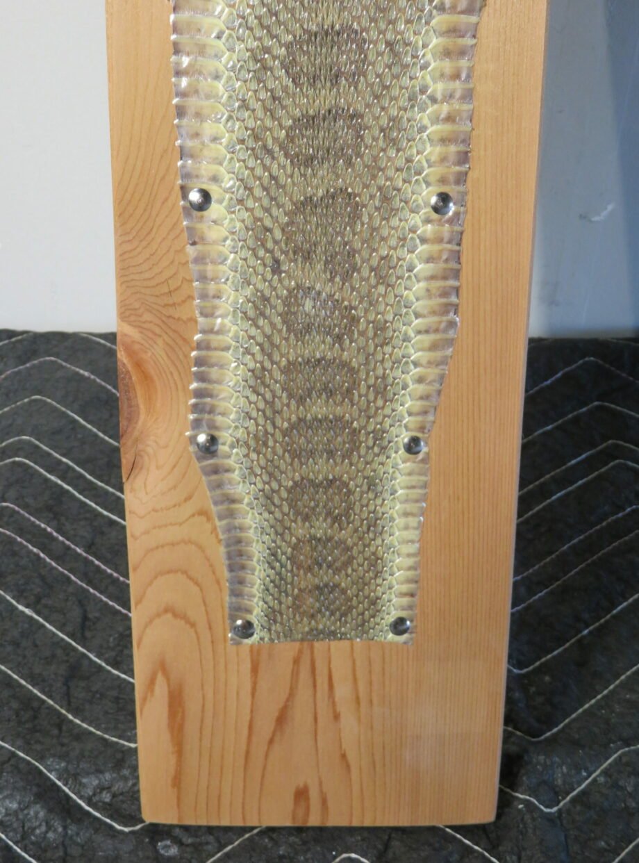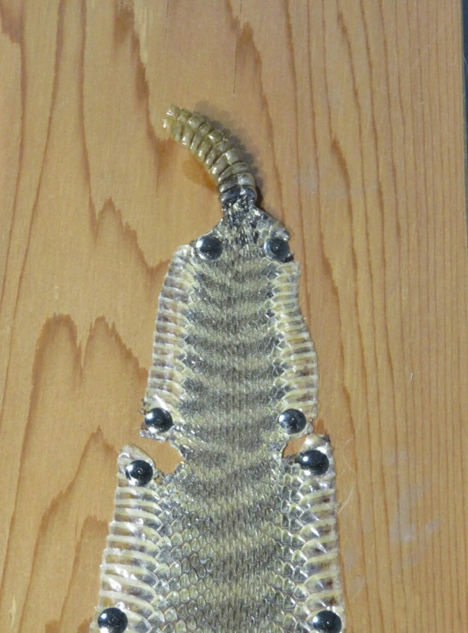 This is a cleaned and stretched Montana Prairie Rattlesnake skin of good size. The skin is tacked and put on a 1 x 7 x 60 solid cedar board. The whole length of the snake’s skin is 53 inches.