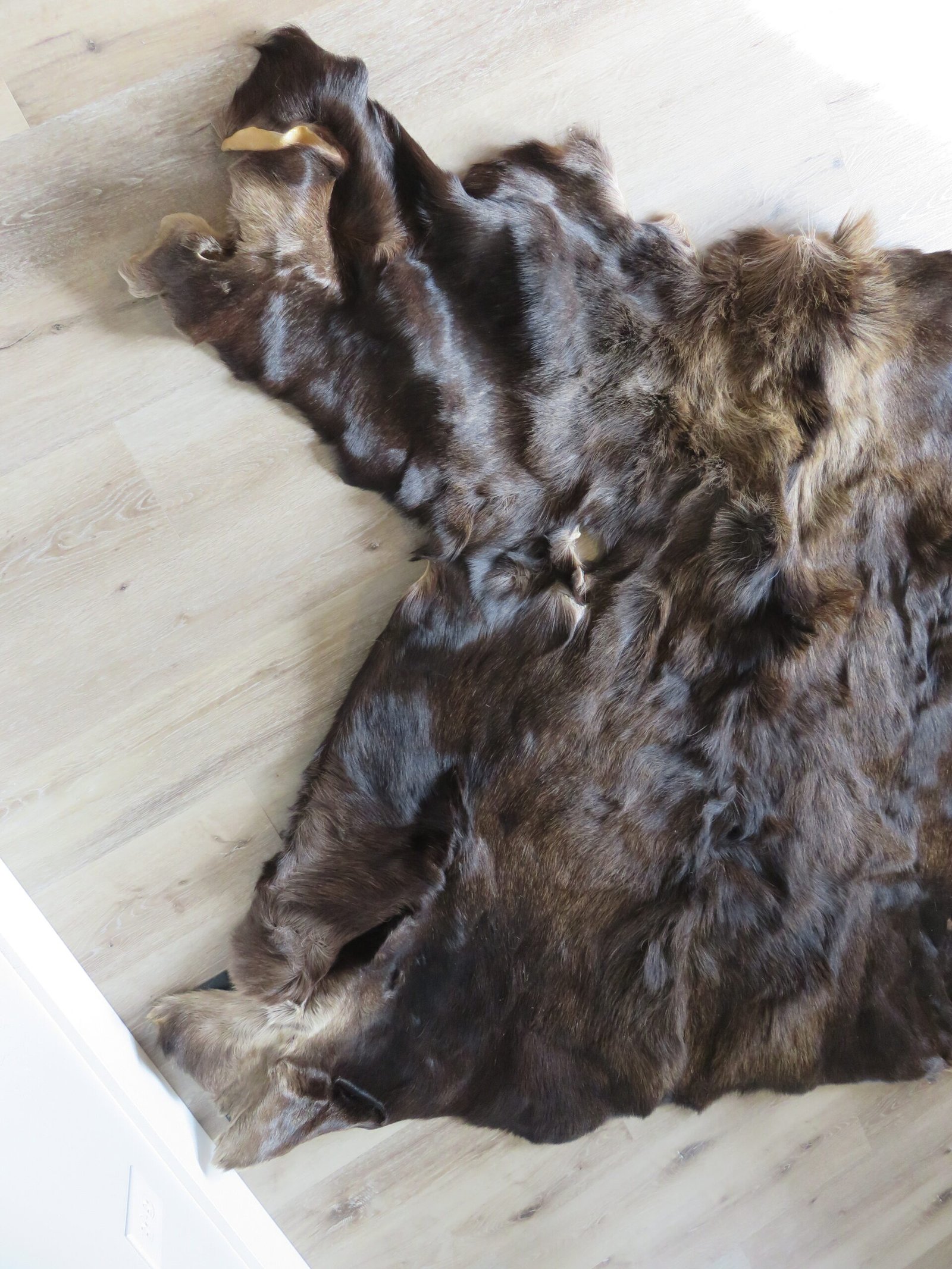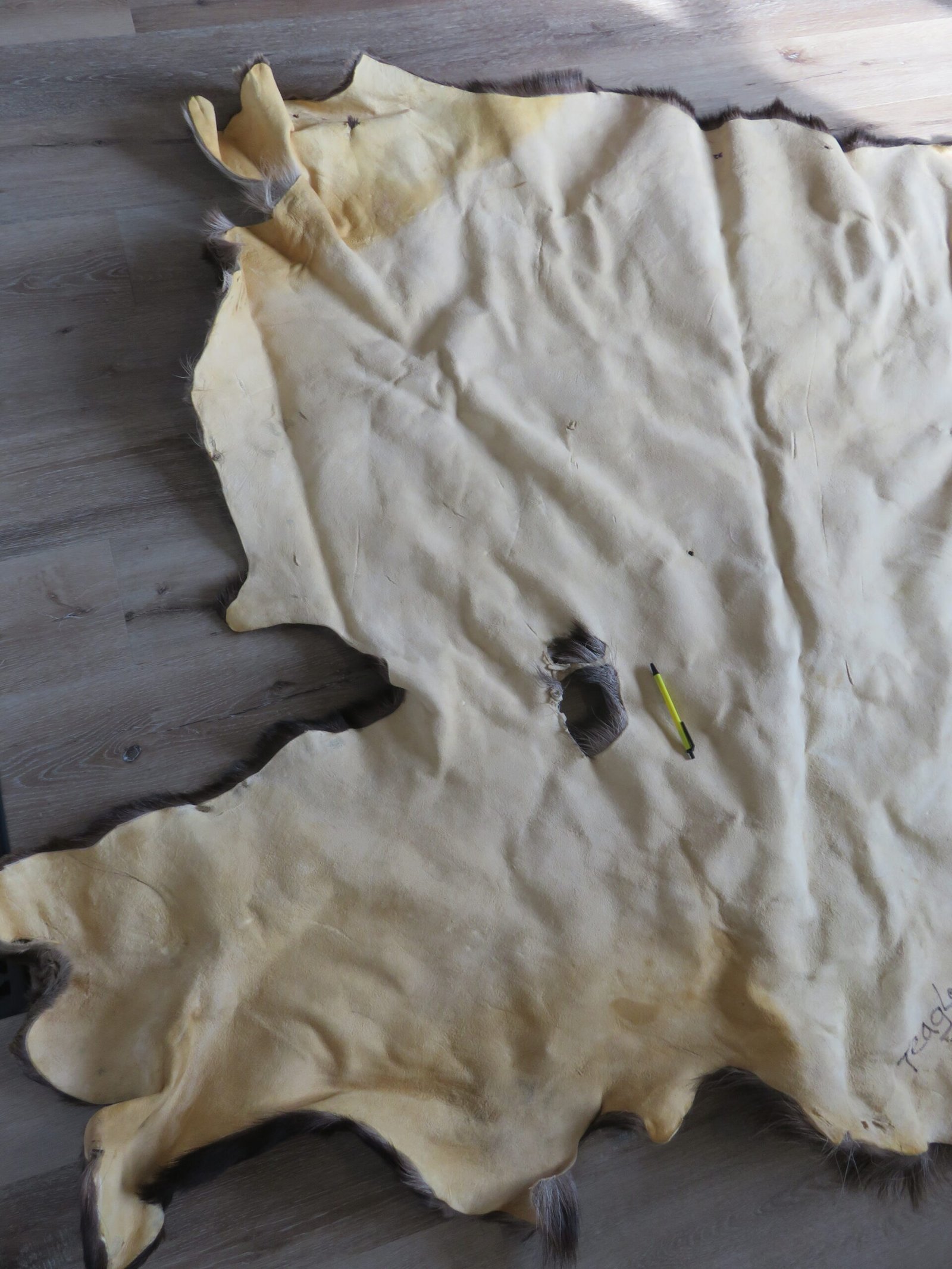 This is a big, expertly tanned moose blanket or skin. It does have a large hole (see photographs attached), which reduces the product’s grade to “Nice.” Nevertheless, the hide of this item is soft, malleable, and has good hair color and thickness. An excellent piece to hang over a railing, couch, or other object, or to exhibit on a level surface.