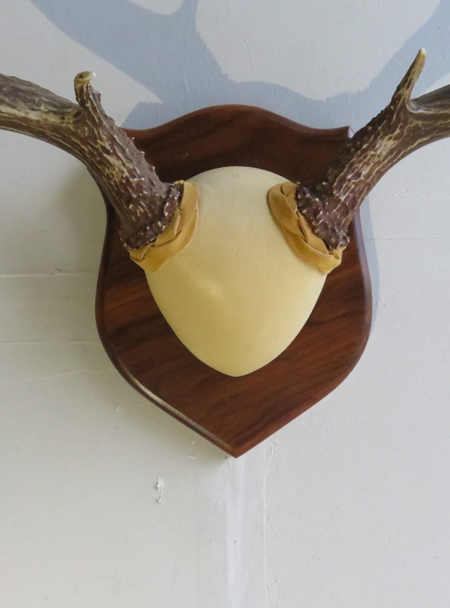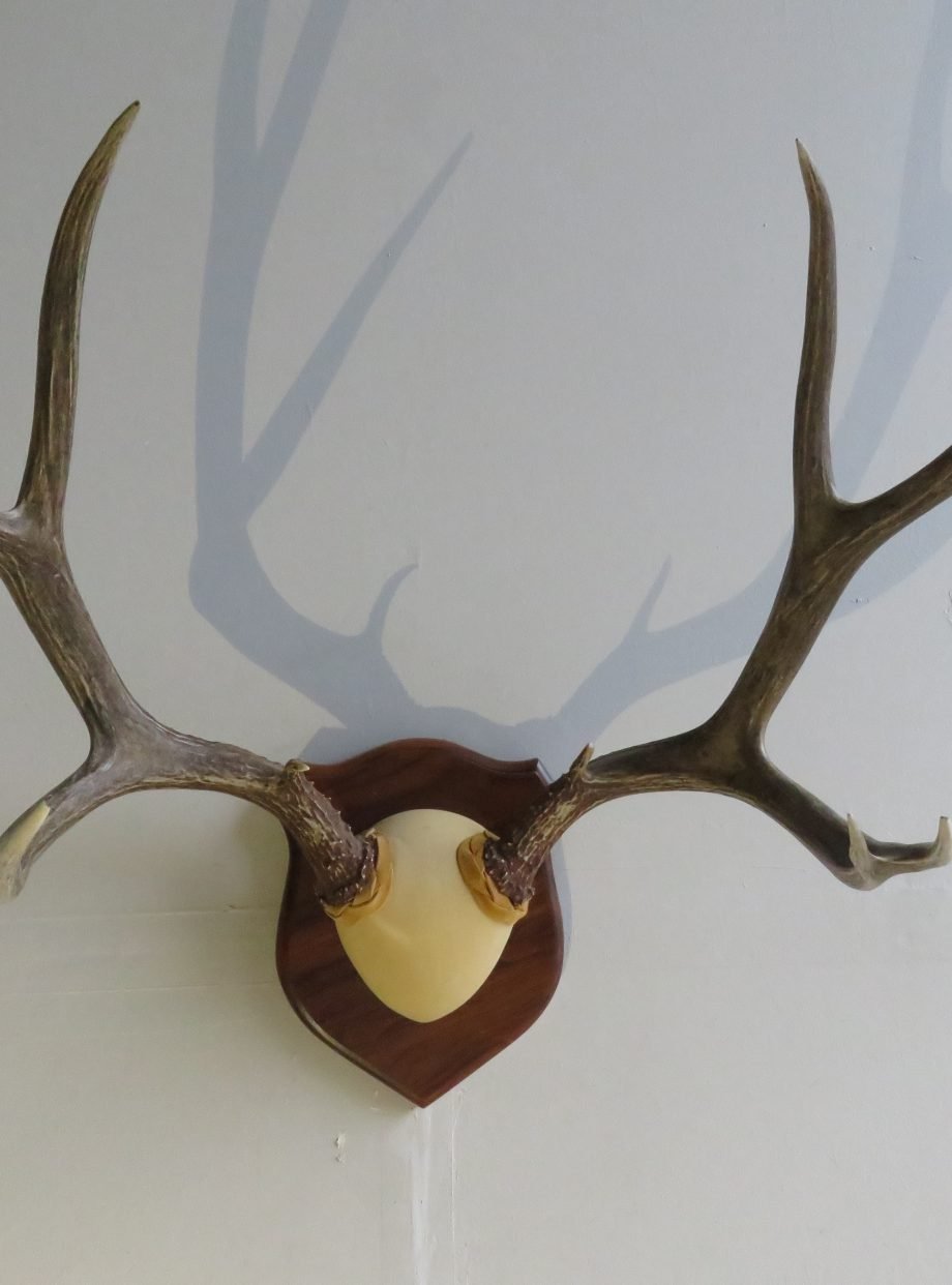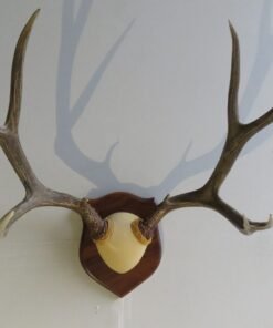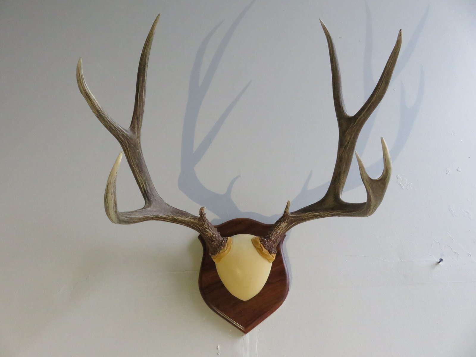 A large Mule Deer rack set over a personalized wooden plaque. (See the pictures attached). The “Excellent” taxidermy workmanship on this item is completed by the skull plate being wrapped in what appears to be leather. The dimensions of this muley rack are 4 x 5, or nine points (Eastern count). A fantastic rack with outstanding tine length and superb hue. has a good spread as well, with a maximum width of 23 inches. As a stand-alone or complementary piece, this mount would be a lovely addition to the house or place of business.
