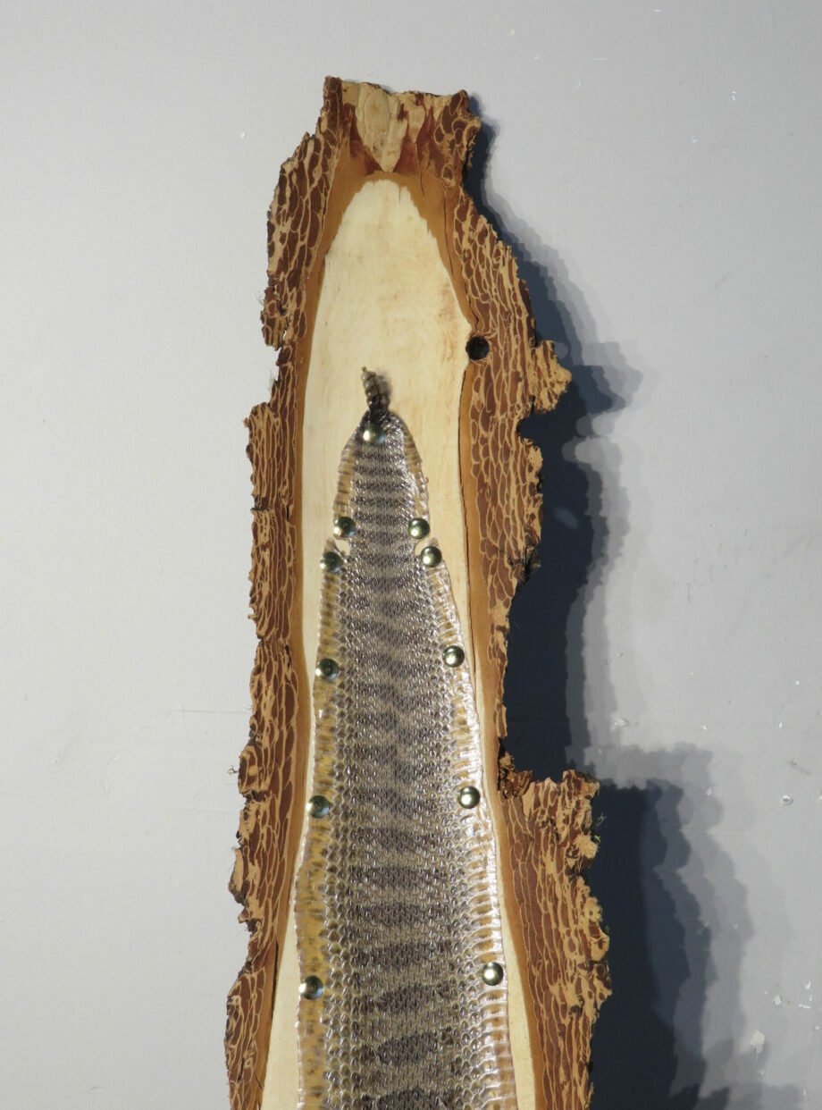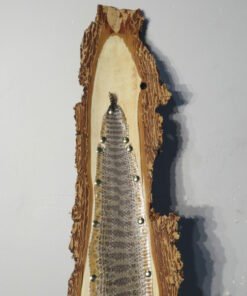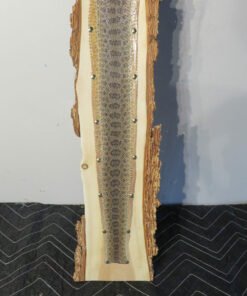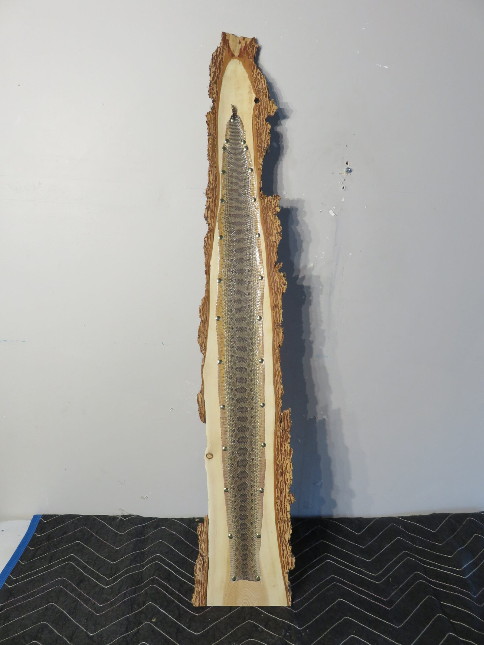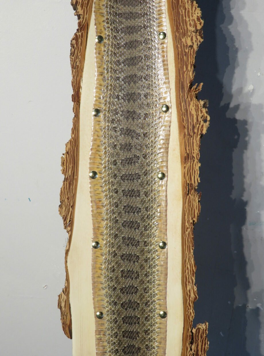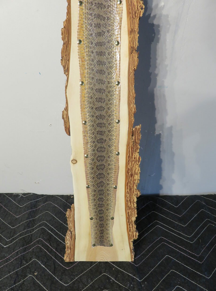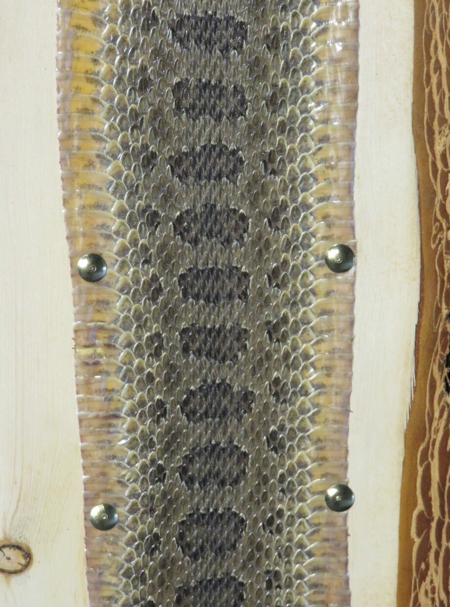 This Western Montana Prairie Rattlesnake taxidermy piece is really cool. The skin has been stretched over a rough-sawn piece of wood and has an amazing pattern and color. The bark on the back of the wood creates a wonderful rustic show. The head of the rattlesnake has been removed, but the rattles are still there (see photographs).