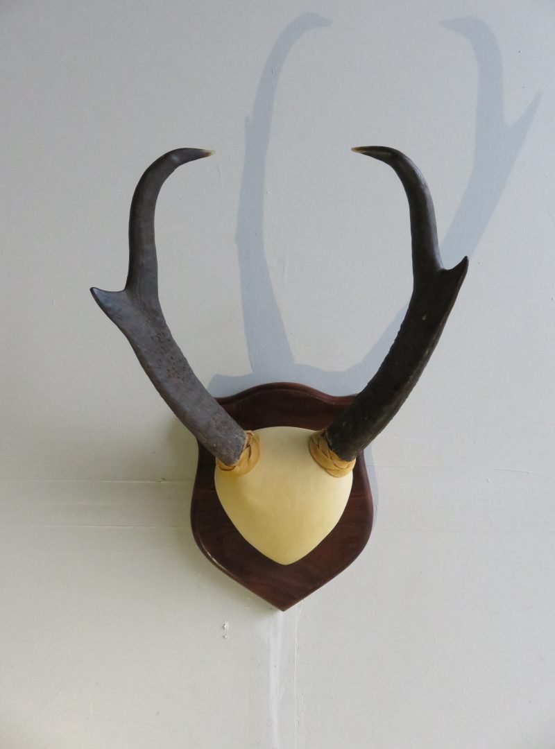This is a lovely set of pronghorn antelope horns on a personalized plaque. Mounted atop a wooden plaque, the skull plate has been wrapped in leather. The sides of this enormous set of horns are 14 2/8″ and 14 4/8″. The maximum breadth of these horns is 12 3/8 inches, and the points are separated by 4 4/8 inches. The white that is seen at the very tips of the horns on this pair is called ivory tips. (See the pictures attached).