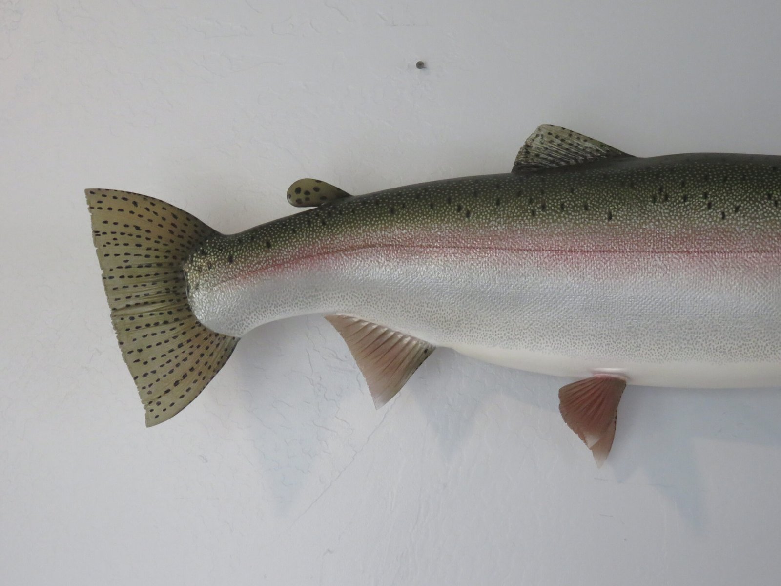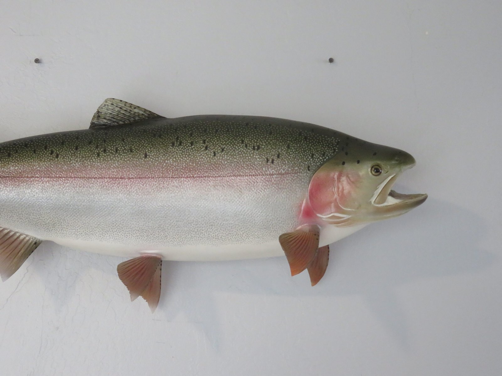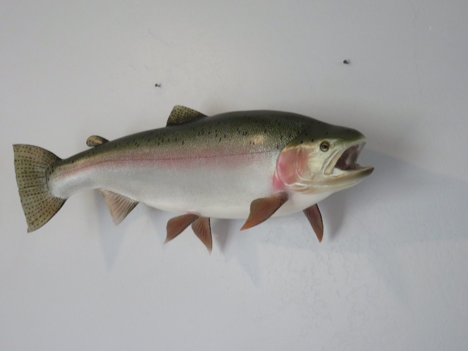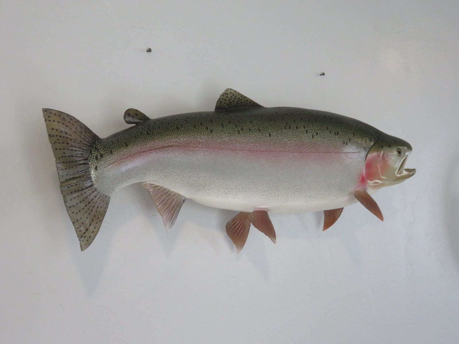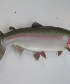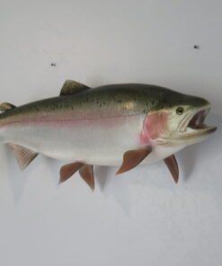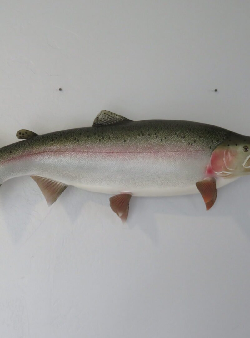 This is a Rainbow Trout reproduction mount. The fish weighed an estimated 12 pounds and was 29 inches in length. As shown in the attached photographs, the body is bowing in a swimming motion. The artist’s coloring and pattern on this piece are excellent. The overall mount quality is rated as “Premier.”