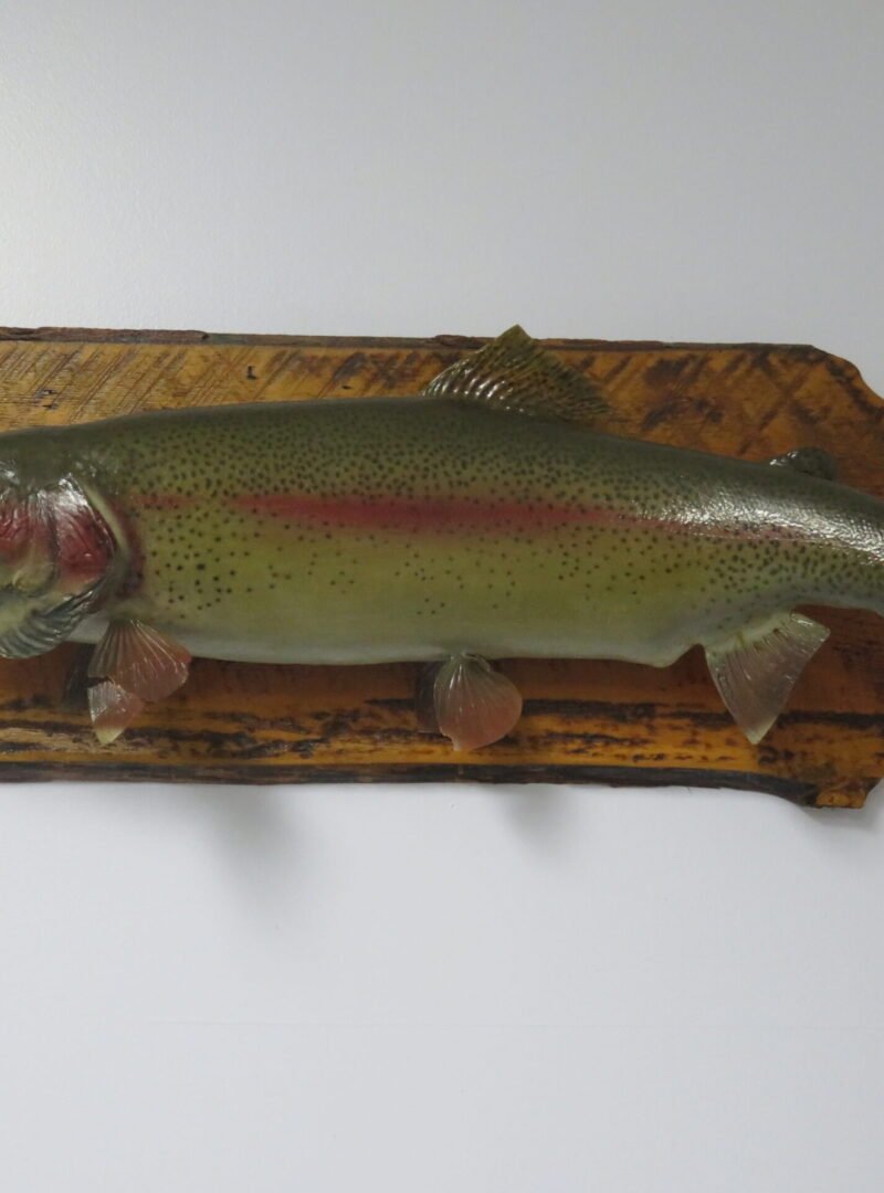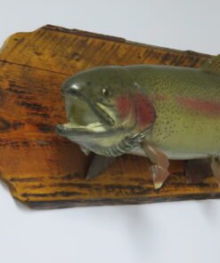 A large rainbow trout on a plaque made of solid wood for convenient display. This mount is slightly over 16 inches in diameter and 28 inches long. This fish weighs about eight pounds. A lovely piece to put on display in your house, cabin, lodge, or place of business. Unfortunately, the tail and two lower fins are damaged (see attached photographs). We give this item a “Nice” overall quality and appeal rating because of the current damage, which is evident upon close study.