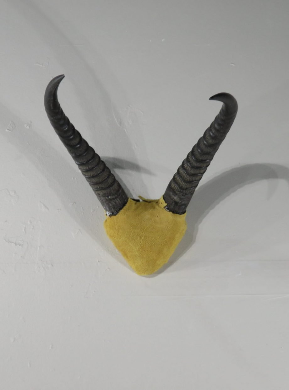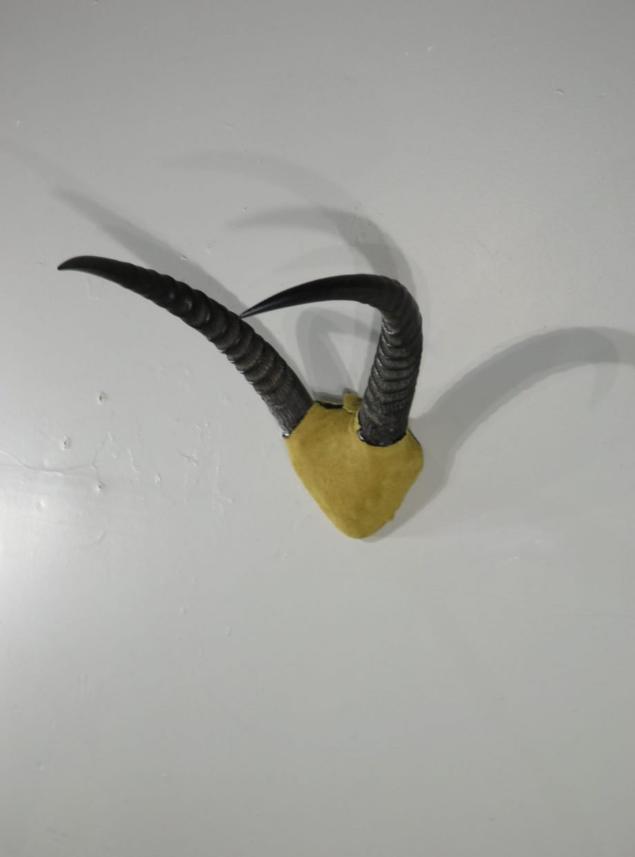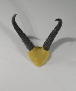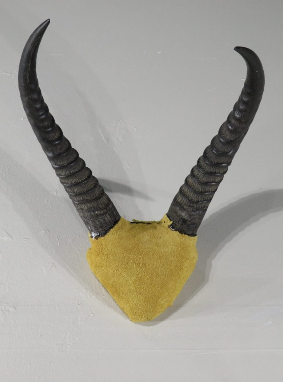 The horns are prepared for wall hanging after being wrapped in suede leather (see pictures). The dimensions of the mount are 11 inches wide by 11 inches high by 10 inches deep. The tips are 7 3/8 inches in diameter.