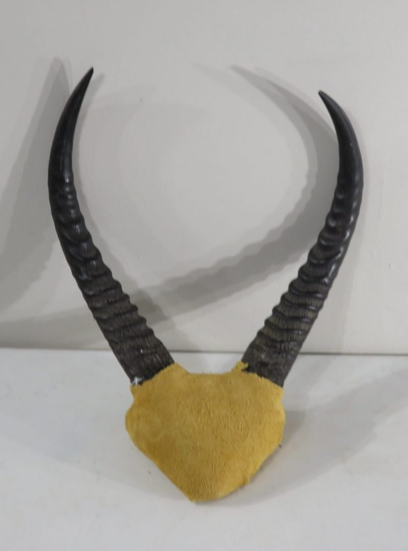 A huge African Reedbuck is the source of this set of horns. Each side of these horns is 13 0/8 inches in length. The circumference of each base is 5 1/8 inches, giving him a net score of 36 2/8 inches. It makes him eligible for a gold medal class buck. The gold level requires a minimum score of 26 4/8. He would be eligible for a record book entry because of his unusually huge set of horns.