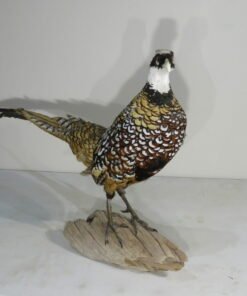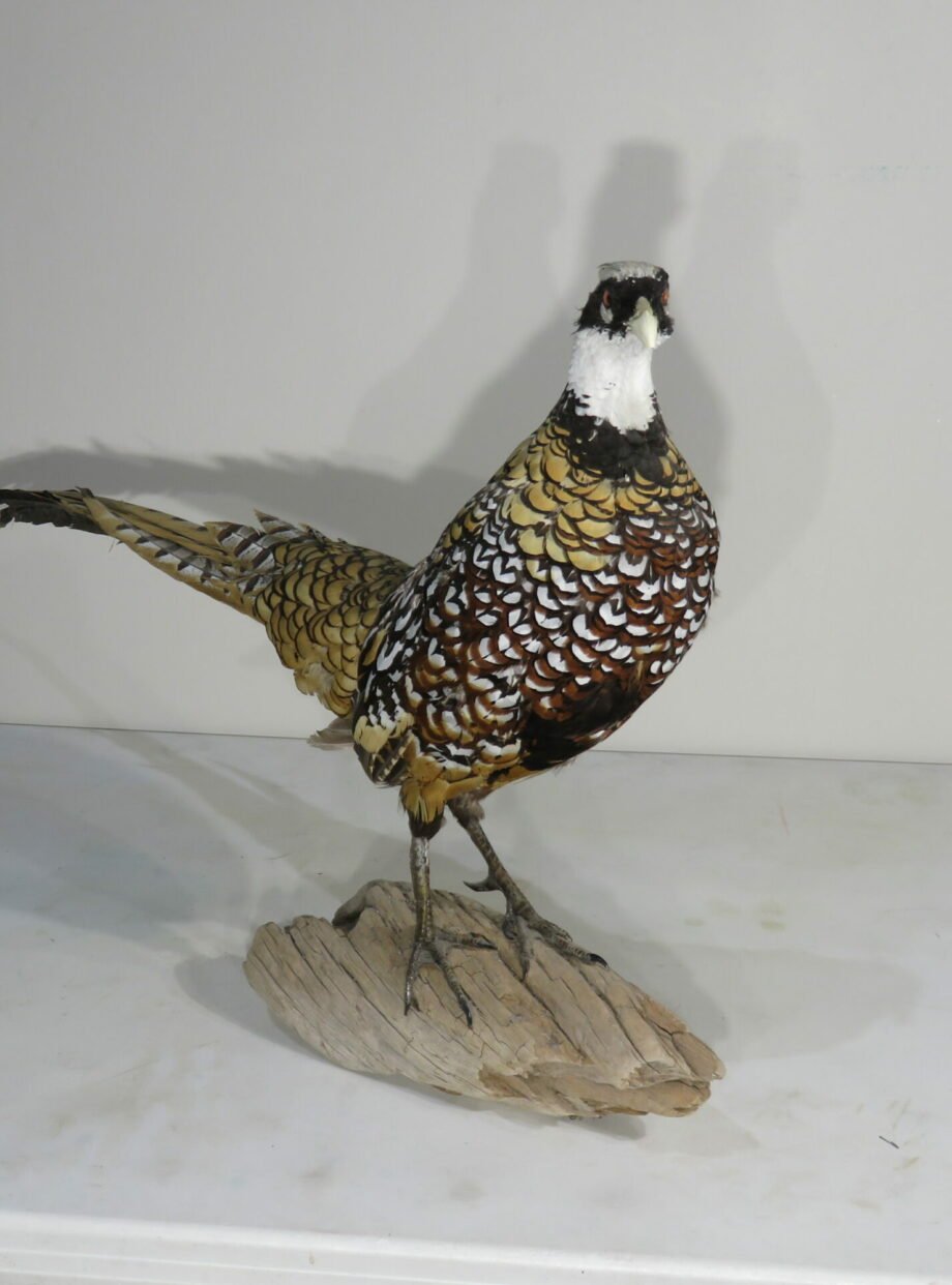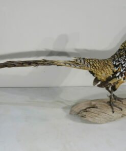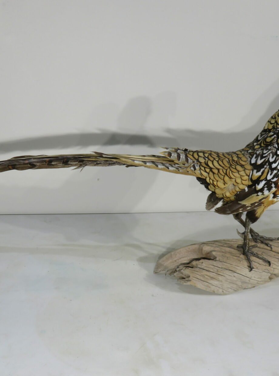 This rooster is a stunning Reeves’s pheasant. A great taxidermy mount that shows the size and color of a huge male of the species. This bird is in a walking attitude, standing on a piece of driftwood with its tail back.