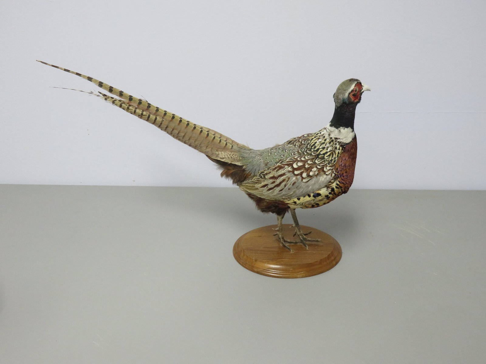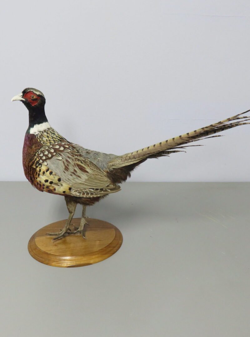 The Ringneck Pheasant taxidermy mount for sale is in a lovely standing position. He is “walking” on a plaque made of solid wood. (See the pictures attached).