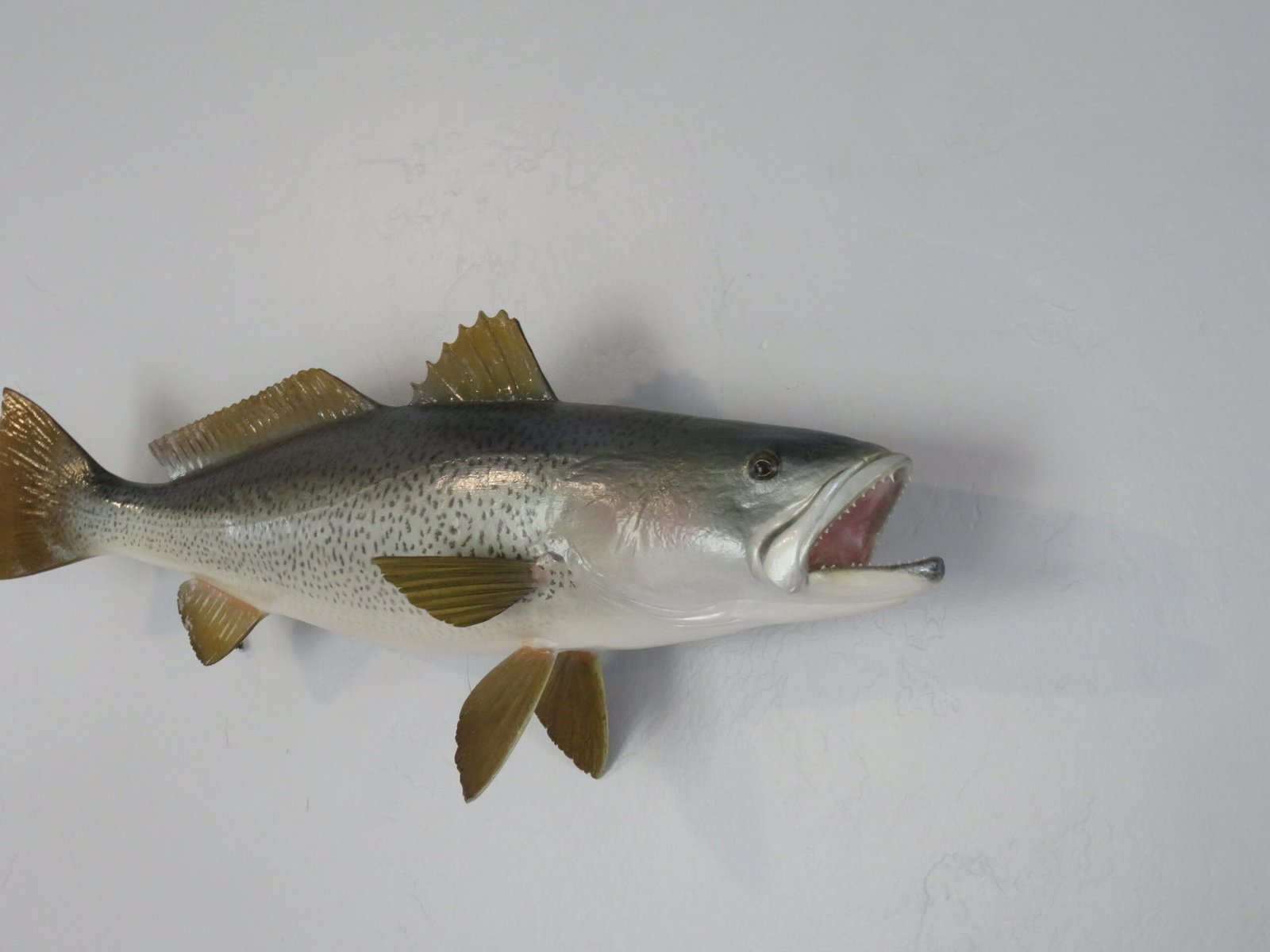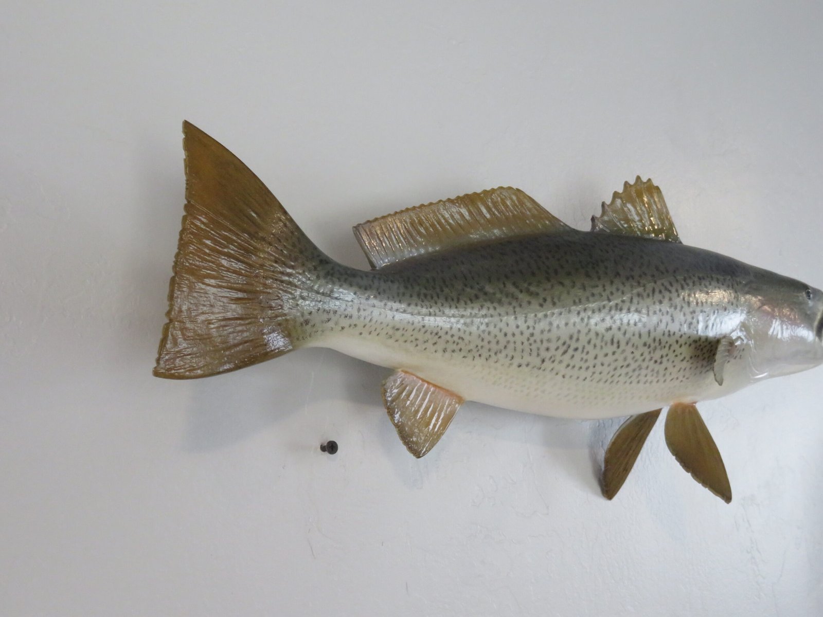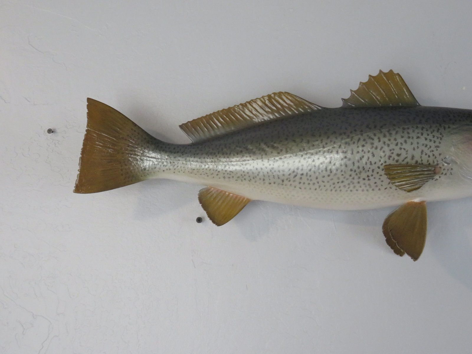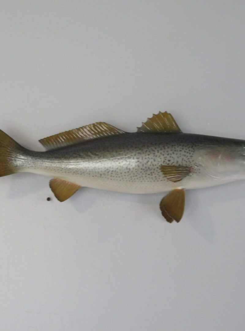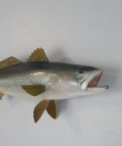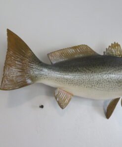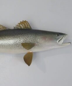 This attractive sea trout was caught off the shore of Delaware. The length of this actual skin mount is 24 inches. 7 3/4 pounds was the live weight. The body is somewhat curved and faces the viewer’s right as they look along the wall.