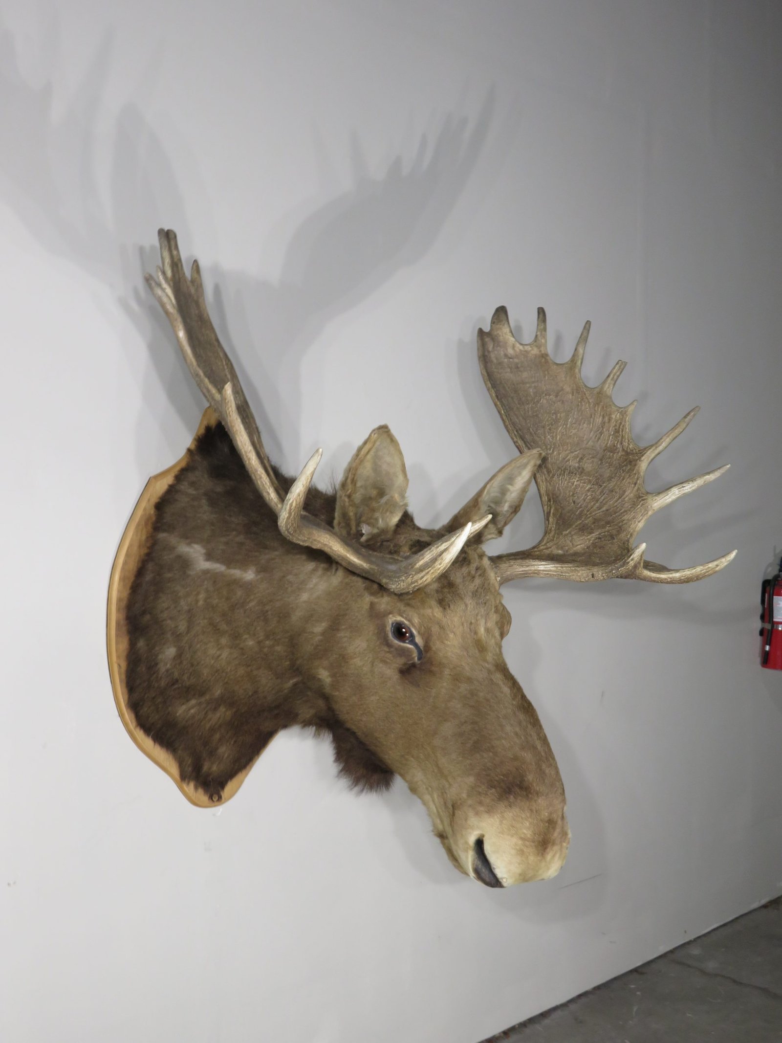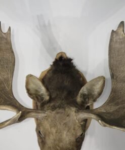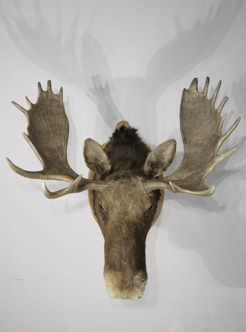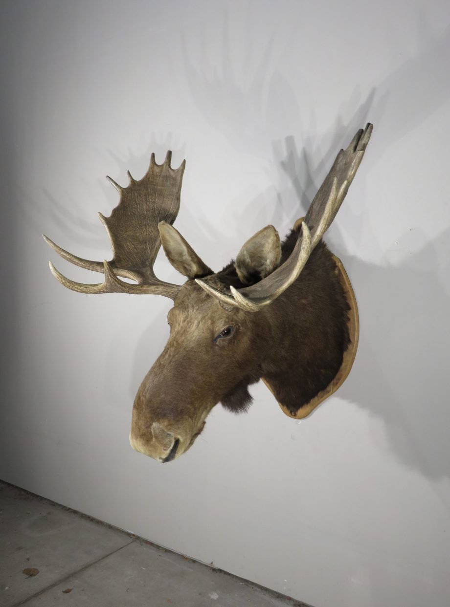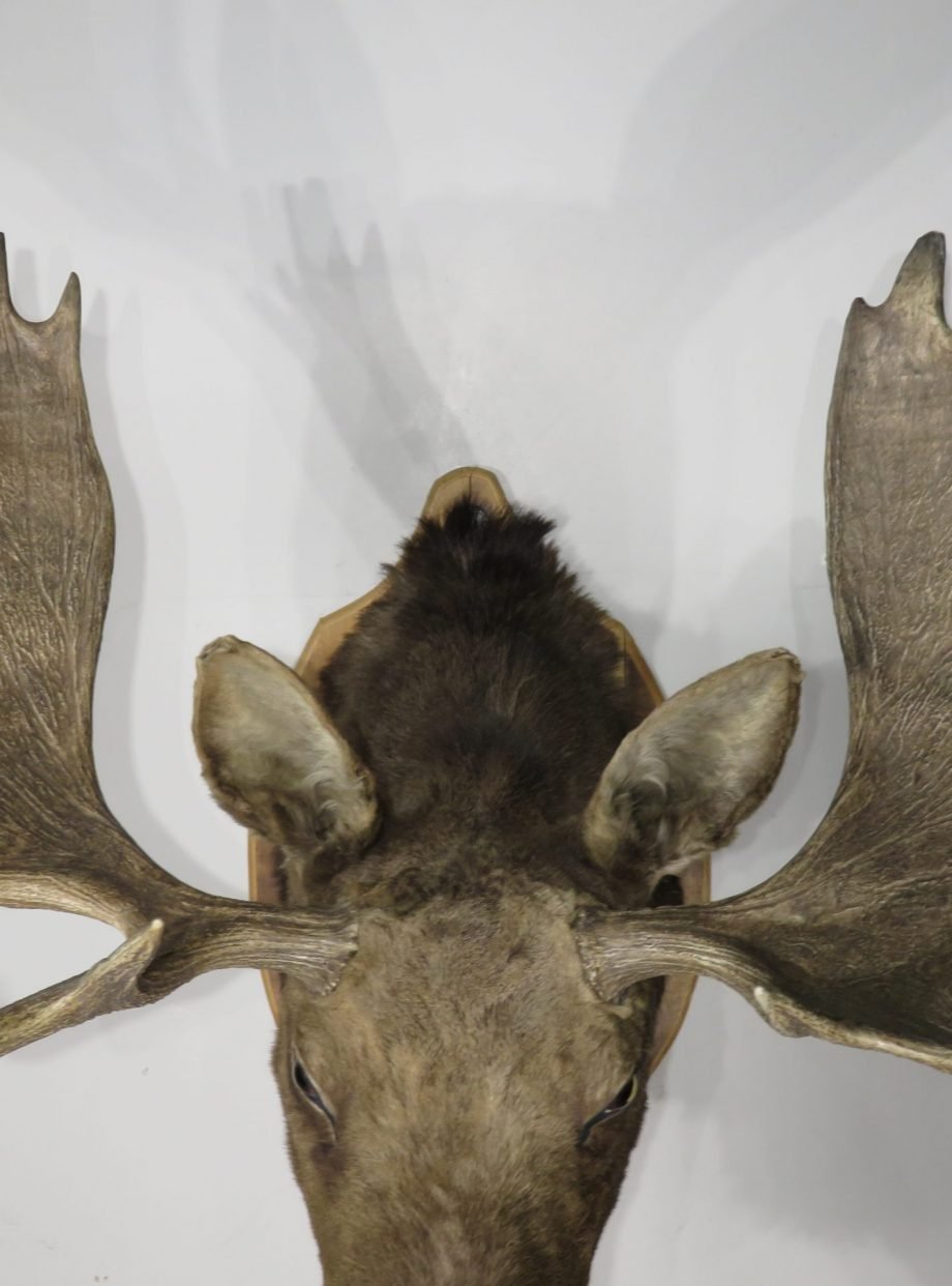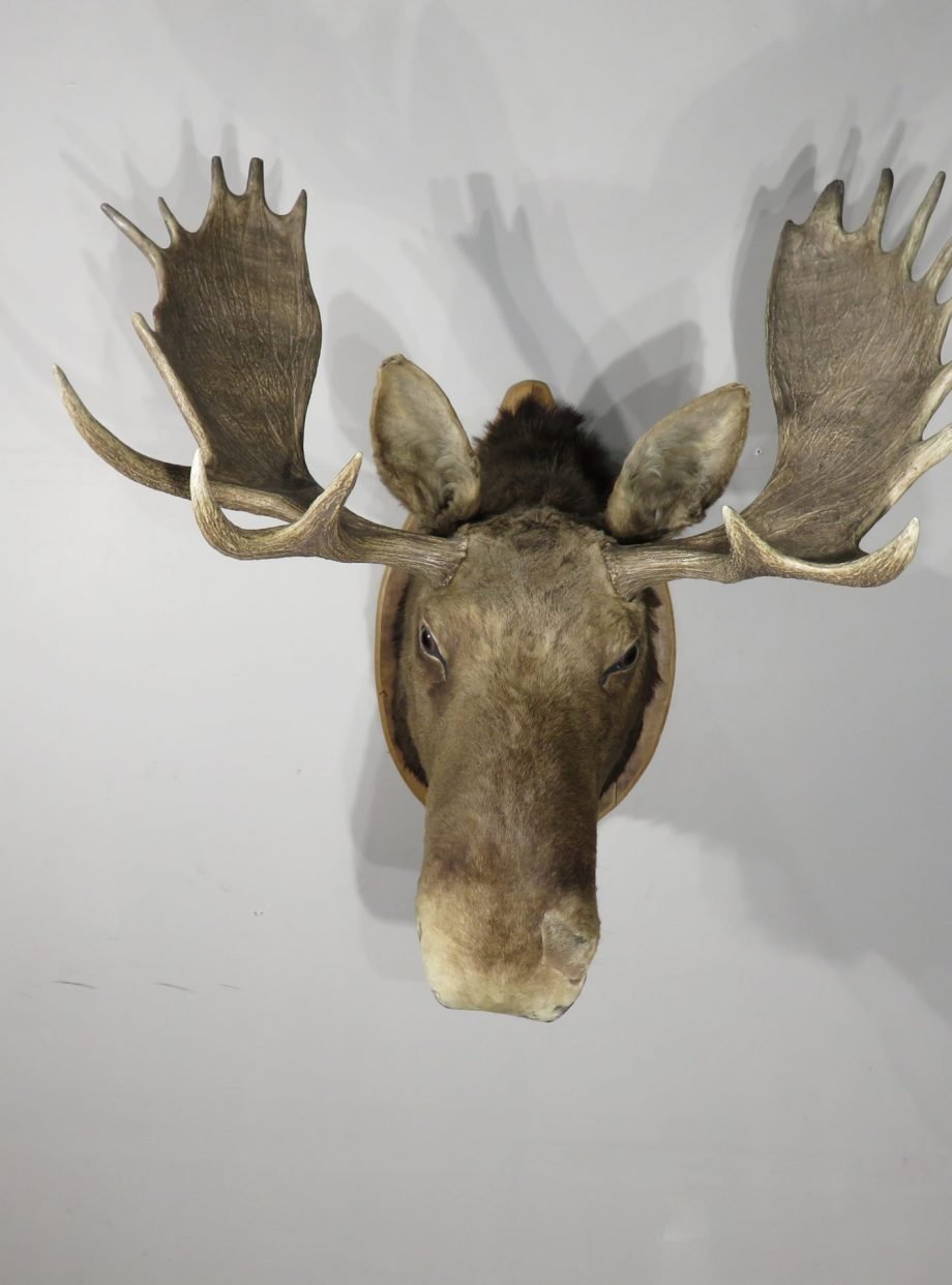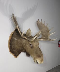 A huge western Montana Shiras moose is displayed on a wooden plaque. For the species, this bull’s paddle is exceptionally long and wide. This mount’s taxidermy work is superb. Excellent thickness and hue of hair paired with a traditional head-forward, looking-forward position.