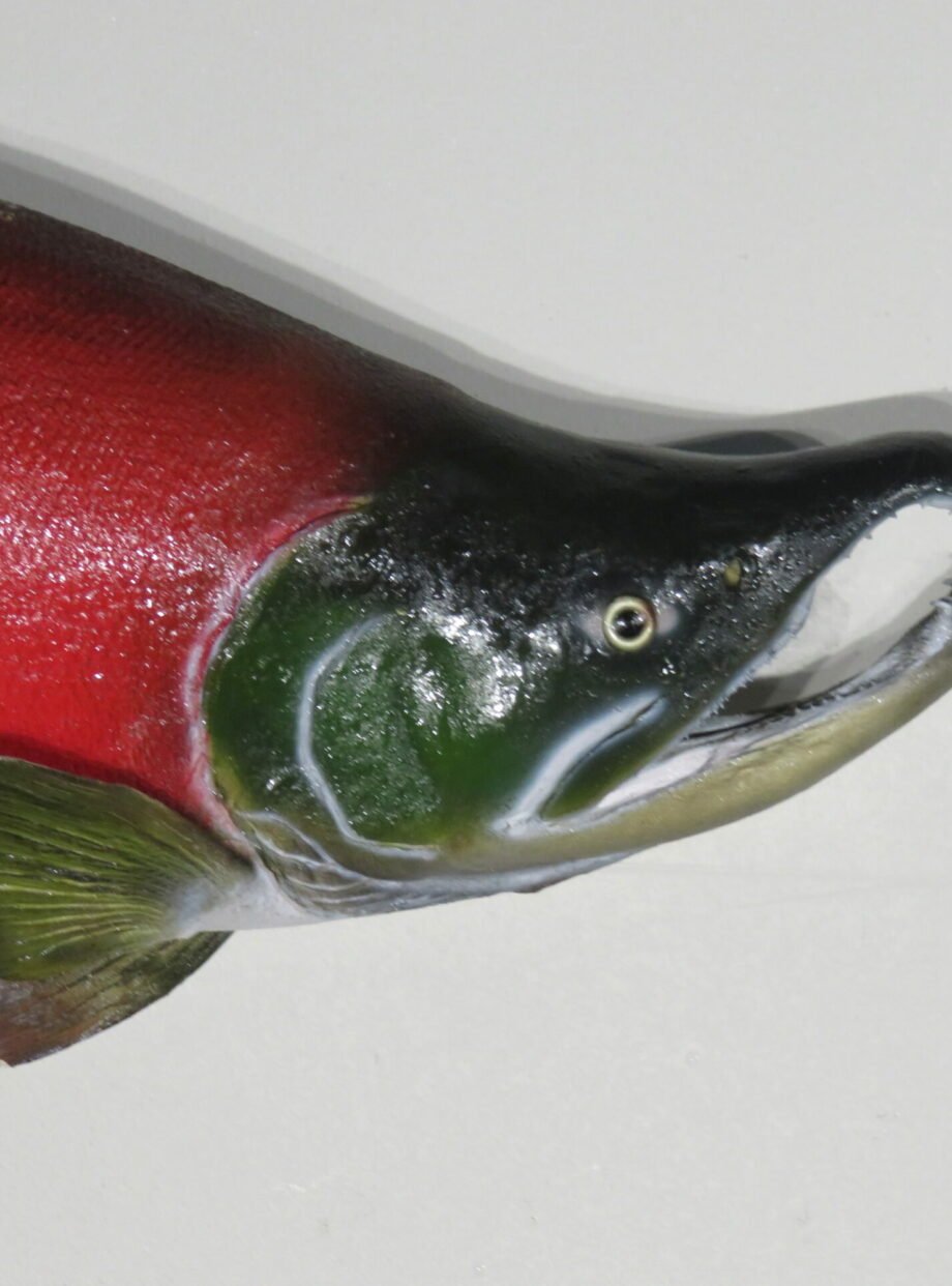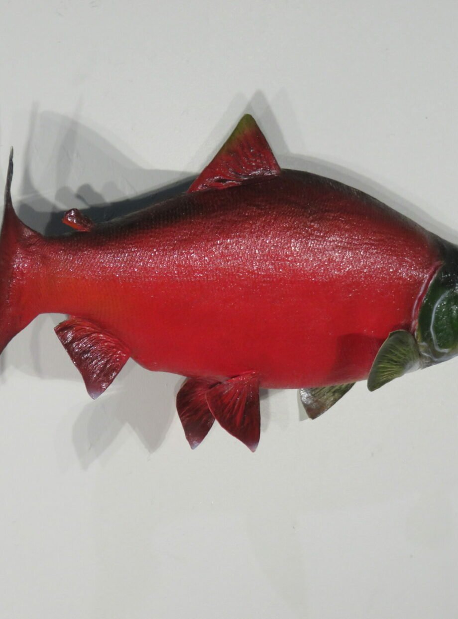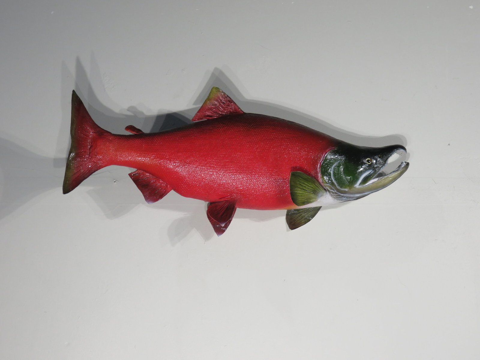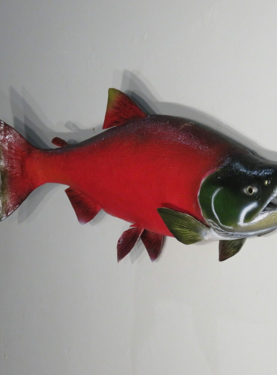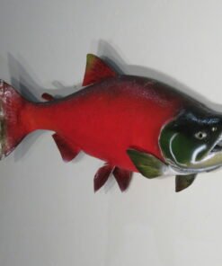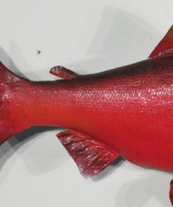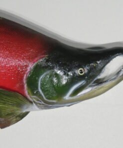 This is a stunning taxidermy of a sockeye salmon! Excellent color on a swimming pose with fish approaching the audience up against the wall. The body has a slight curvature (see attached photographs). This 27-inch fish has a nice open-mouth appearance. Its circumference is 18 1/4″. For a salmon of this size, we calculate that its life weight would have been around 8 pounds.