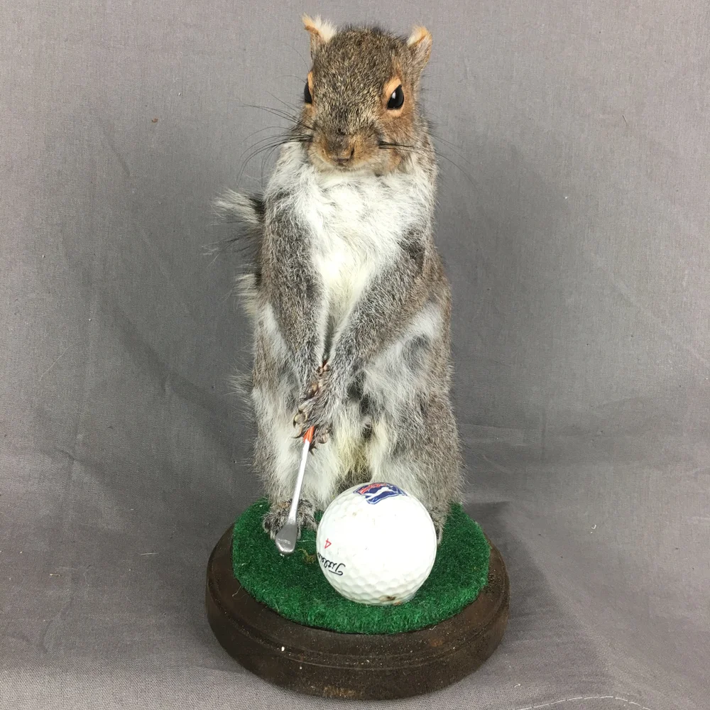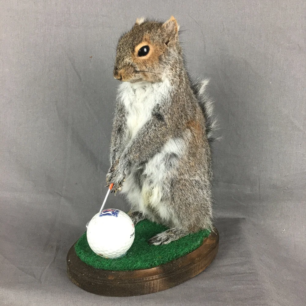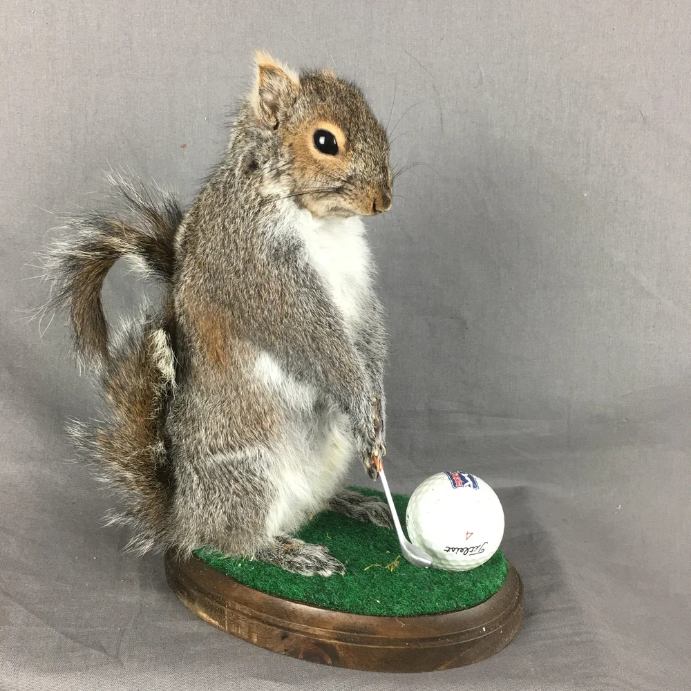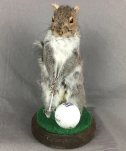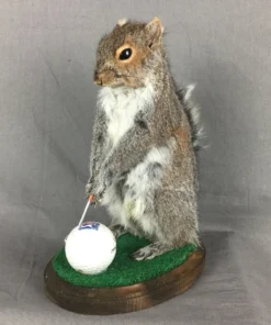 Gray squirrel mounted with a golf club and a regular-sized golf ball. These are wonderful and would look fantastic in your workplace or cabin. They are all distinct and one-of-a-kind. Everybody has a unique personality.