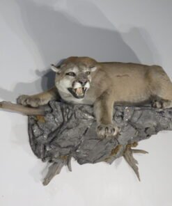 Taxidermy Mountain Lion For Sale is a life-size mount of a mountain lion, also known as a cougar. The cat is down low in a protective stance, with its teeth and claws exposed. The cat is seated atop a large terrain base made of wood and rock.