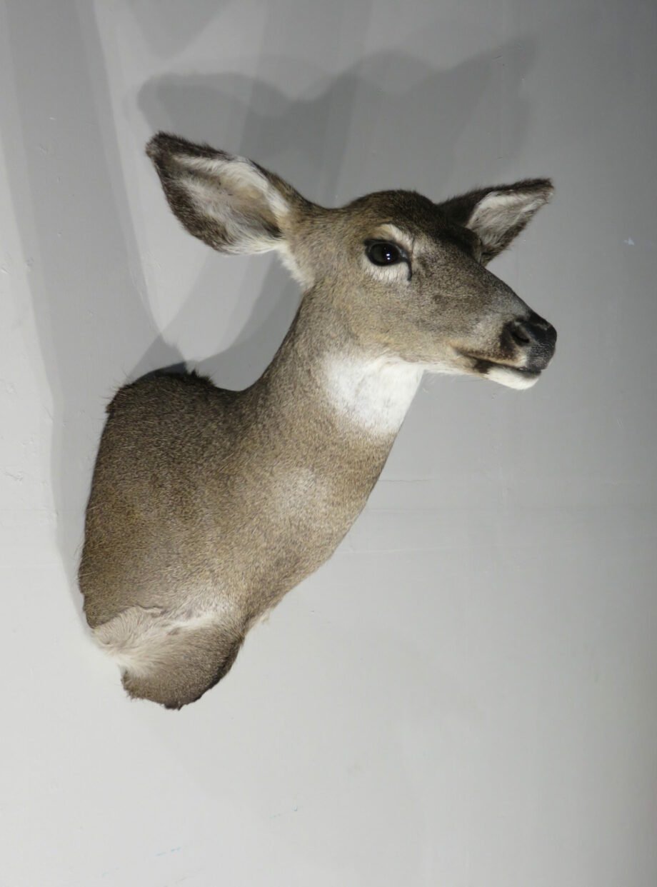 Although the animals themselves are widely distributed throughout the Western United States, their mount is uncommon. In taxidermy collections, bucks are abundant, but does are not. This is your opportunity to add a doe to your collection, as we were able to add it along with a number of other whitetail deer mounts. She strikes a fantastic position with her head up and slightly to the right. She seems to be trying to listen to what might be happening off to the side by turning her ears.