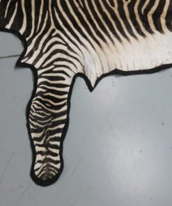 The hide of a zebra, usually with the head and mane still intact, is tanned and preserved to form a zebra rug. In contrast to conventional mounts, the hide is arranged flat, frequently with reinforced edges and felt backing, making it appropriate for wall or floor exhibition.